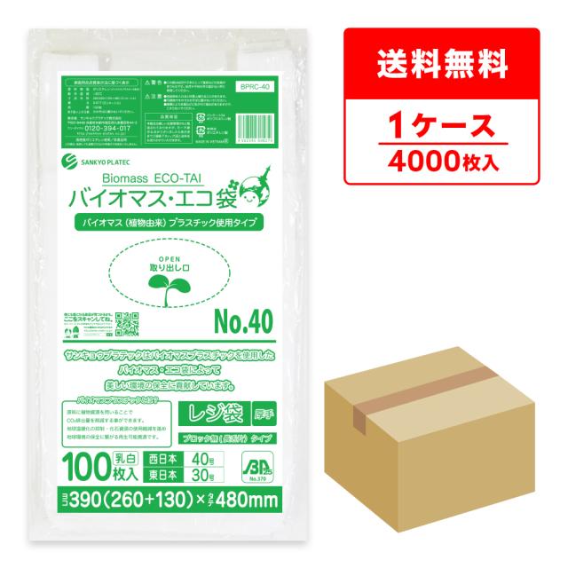 BPRC-40 バイオマスプラスチック使用レジ袋 ノンブロックベロ付きタイプ(長舌片) 西日本40号(東日本30号) 0.017mm厚 乳白 100枚x40冊 送料無料
