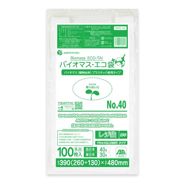 【バラ販売】BPRC-40bara バイオマスプラスチック使用レジ袋 ノンブロックベロ付きタイプ(長舌片) 西日本40号(東日本30号) 0.017mm厚 乳白 100枚