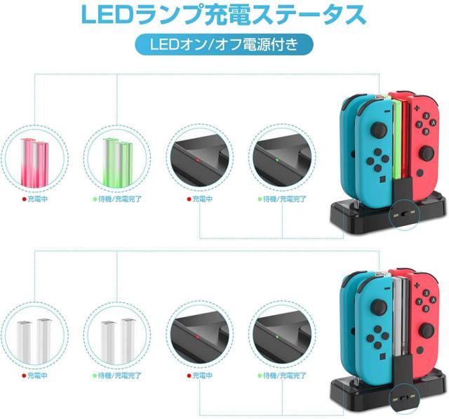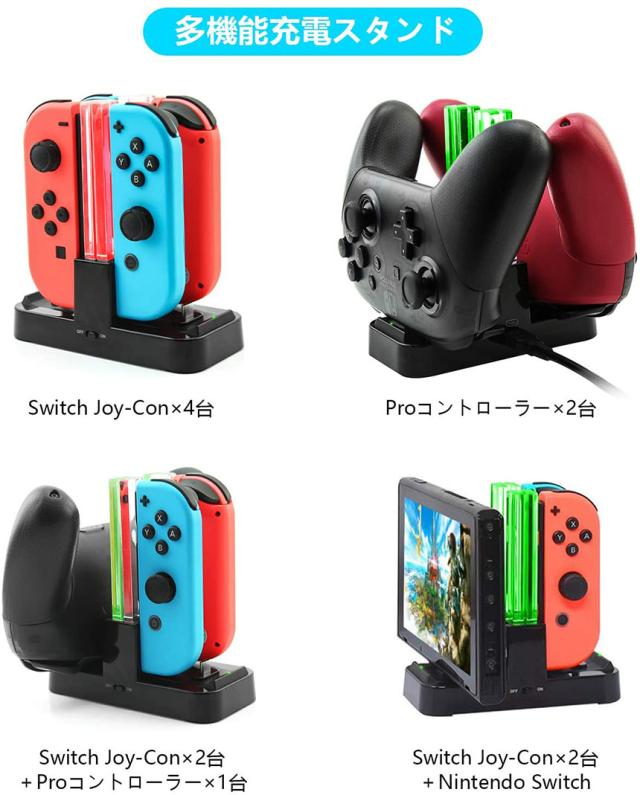 【多機能充電スタンド】Nintendo Switch用 Joy-Con&Proコントローラー充電スタンドがいよいよ発売。「充電方法1:Joy-Con×4台」、「充電方法2:Joy-Con Proコントローラー×2台」、「充電方法3:switch Joy-Con×2台+Proコントローラー×1台」【LED ライトインジケーター】 明確なデュアル色のLED ライトインジケーターが充電状態を示します。Joy-Con/Proコントローラーの充電状態が分かる便利なステータスランプ搭載でJoy-Con/Proコントローラーの充電完了を個別にお知らせする。
