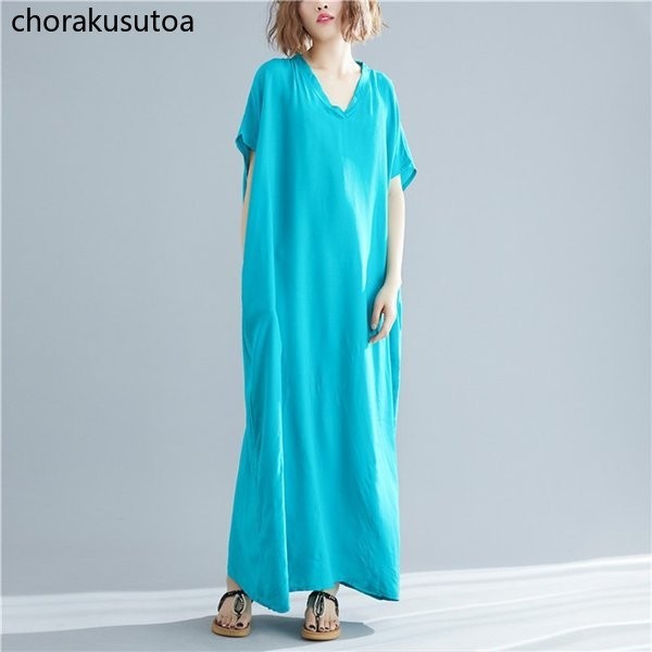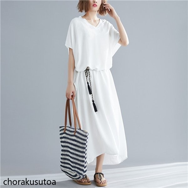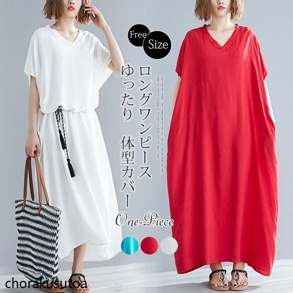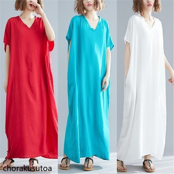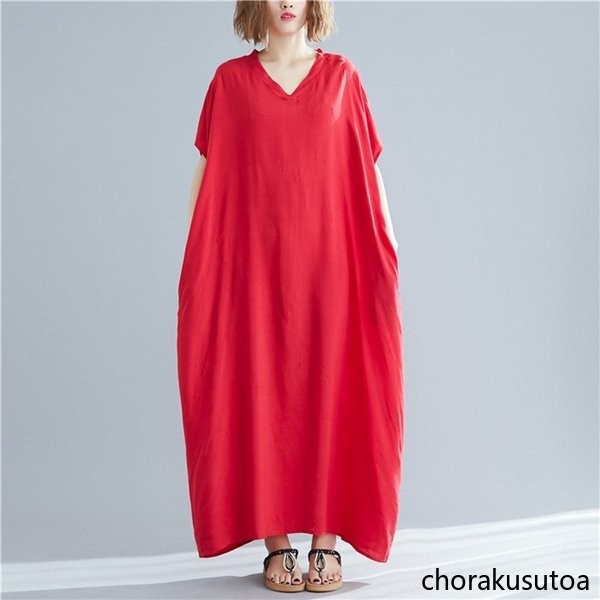 マキシワンピース レディース 大きいサイズ 夏ワンピース ゆったり 体型カバー 半袖 ロングワンピース マキシ丈 Vネック 無地 着痩せ 夏物 30代 40代 50代