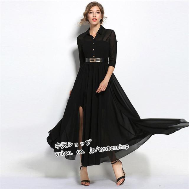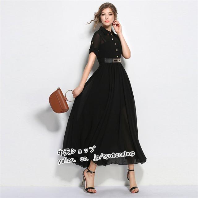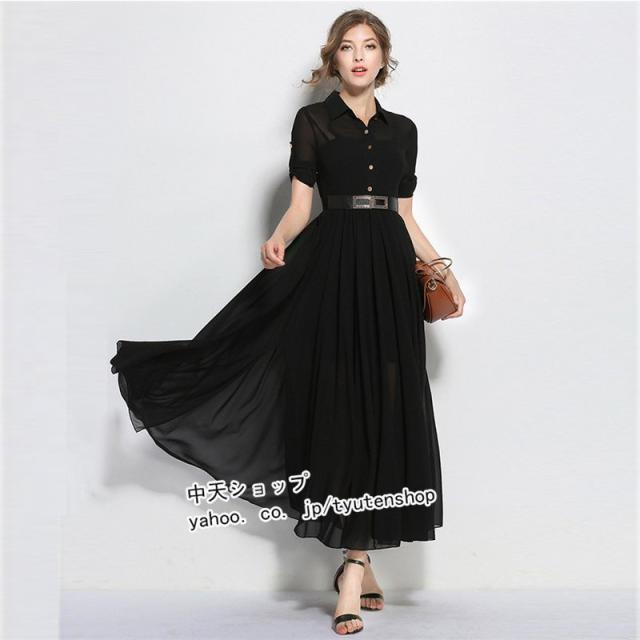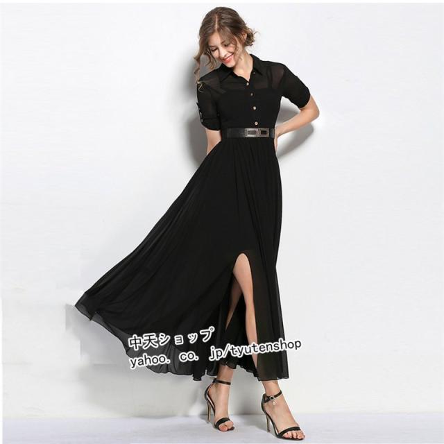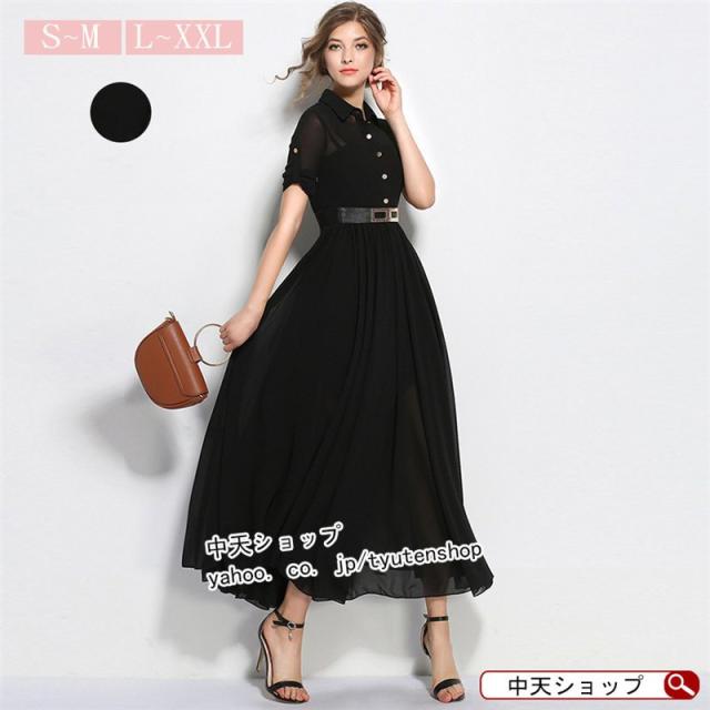 ワンピース レディース ロングワンピース 半袖 シフォンワンピ フレンチスタイル エレガント オシャレ 折り襟 シンプル 通勤 OL 着痩せ