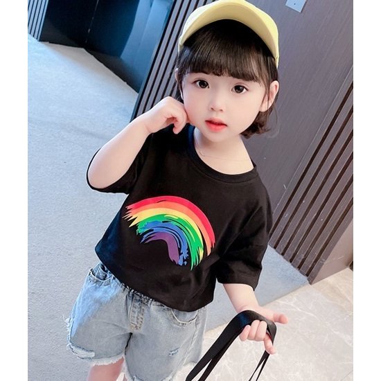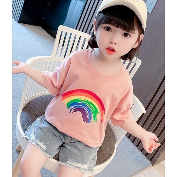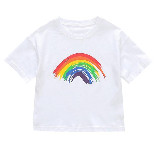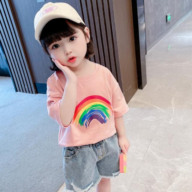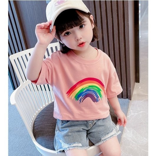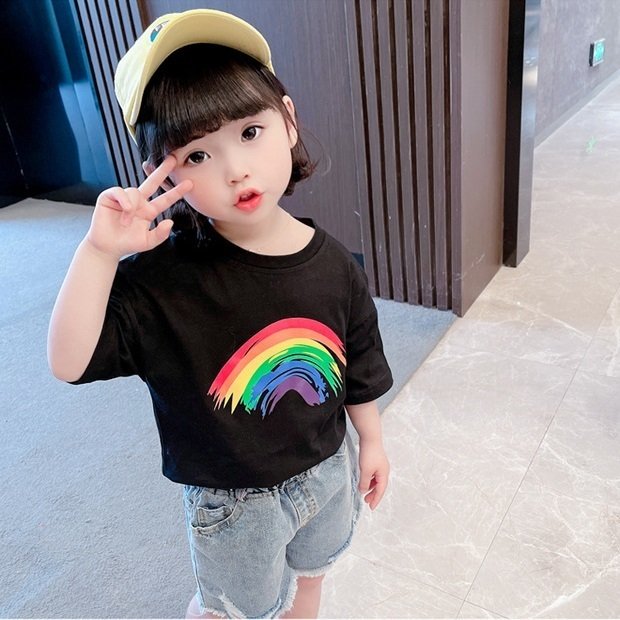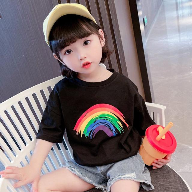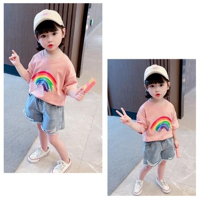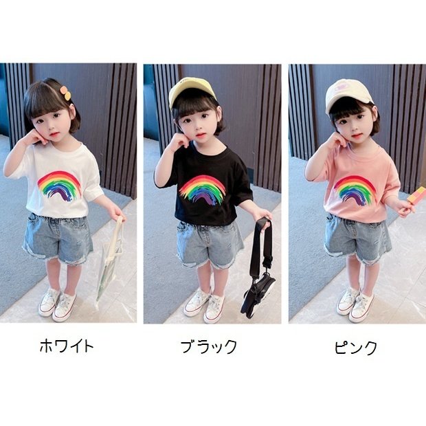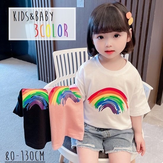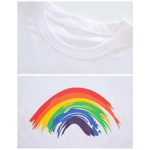 Tシャツ 半袖 カットソー キッズ 子供服 ベビー 女の子 男の子 男女兼用 トップス ラウンドネック 虹 レインボー プリント入り シンプル 単色