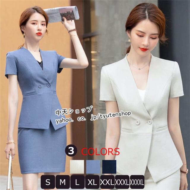 スカートスーツ レディース 2点セット フォーマルスーツ 半袖ジャケット+ミニスカート スリム Vネック 大きいサイズ ビジネス 事務服 冷房対策 着痩せ 春夏