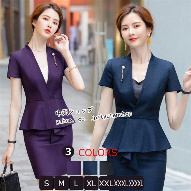 スカートスーツ レディース 2点セット フォーマルスーツ 半袖ジャケット+ミニスカート 春夏 Vネック スリム 大人 冷房対策 入学式 卒業式 乗務員 事務服