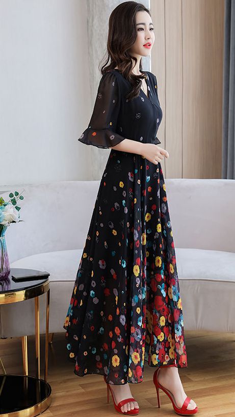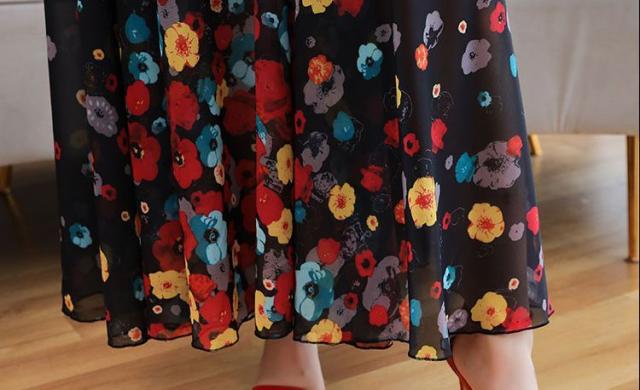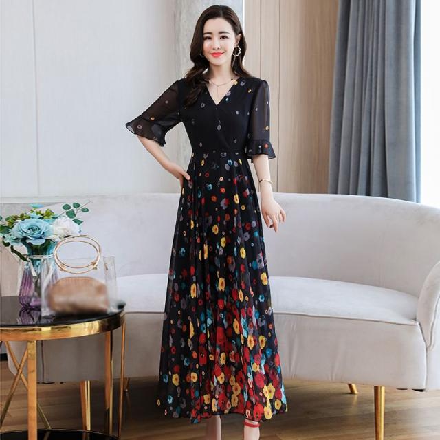 ワンピース 半袖 Vネック 袖フレア 小花柄 シフォン 透け感 大きいサイズ ロング丈 デート フェミニン 女子旅 美人 きれいめ 休日 清楚