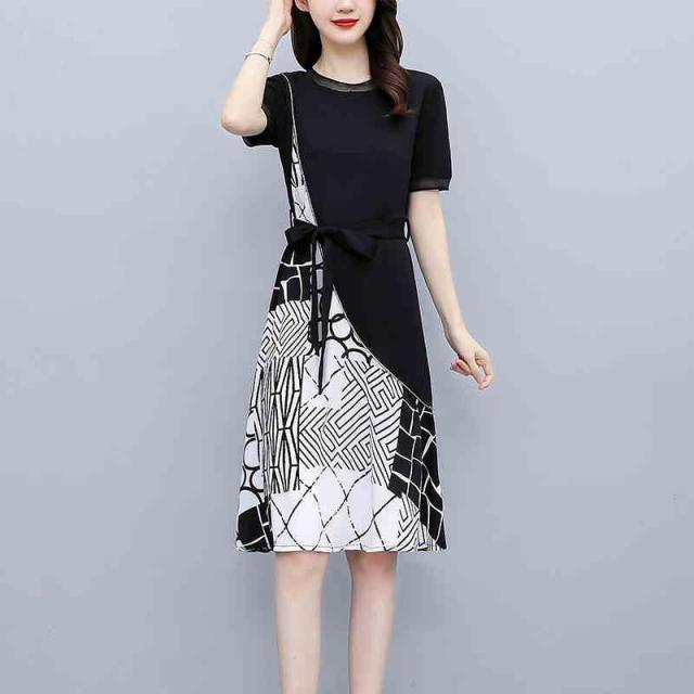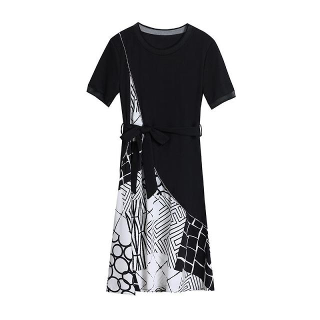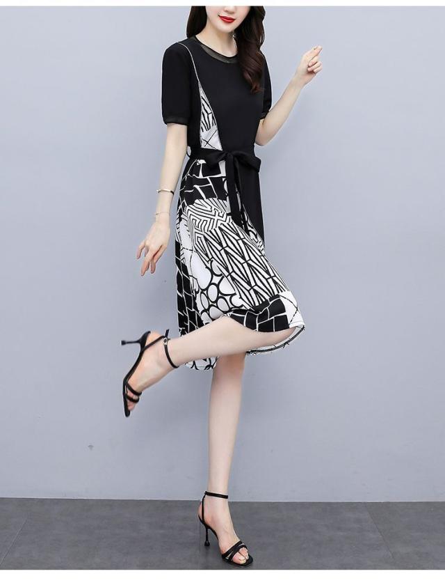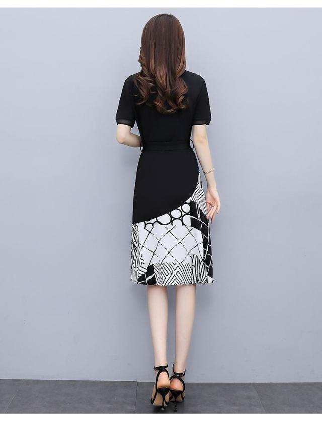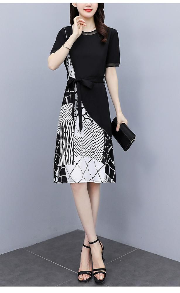 ワンピース プリント柄 ラウンドネック ウエストリボン 大きいサイズ モノトーン リモート 学校行事 清楚 大人可愛い ママ 母親 クール