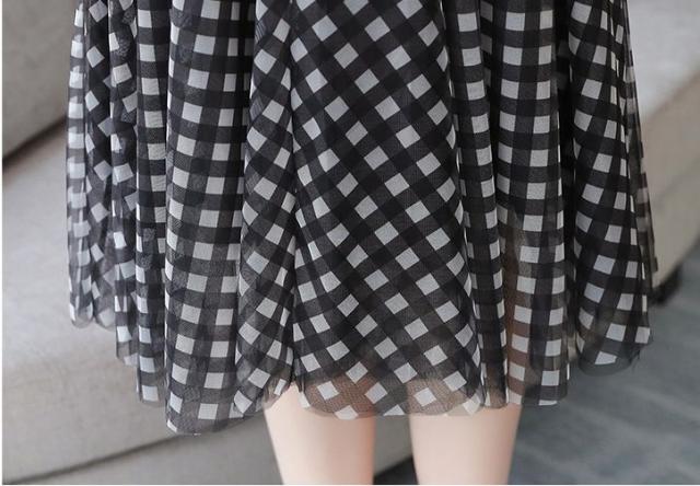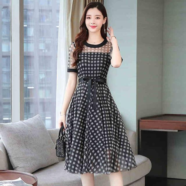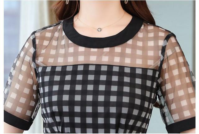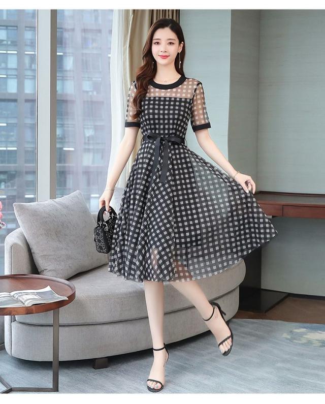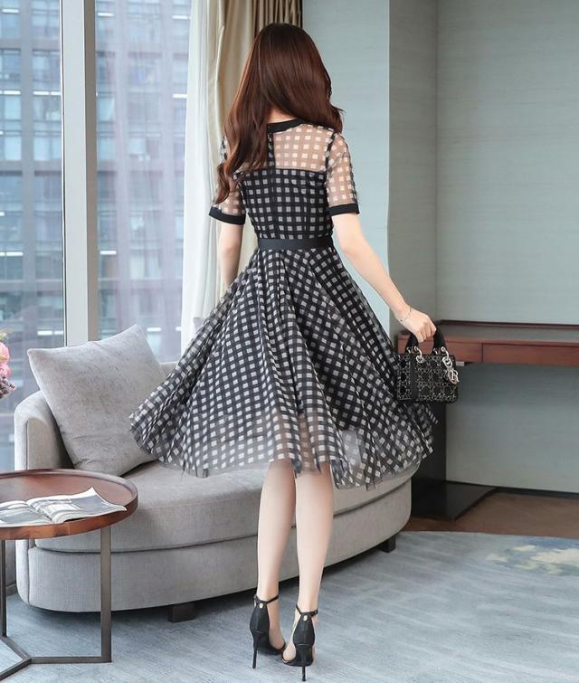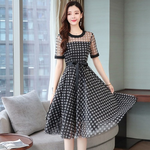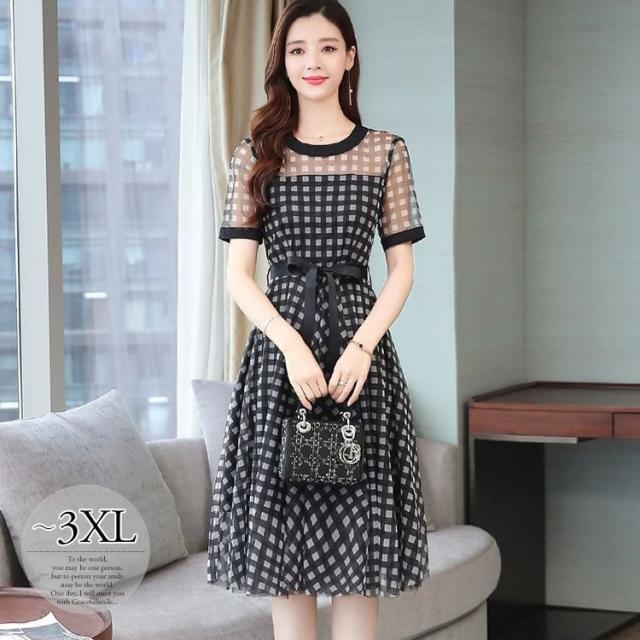 ワンピース チェック柄 ラウンドネック 半袖 透け感 涼しげ 上品 食事会 大人カジュアル ママスタイル 学校行事 休日スタイル ドライブ