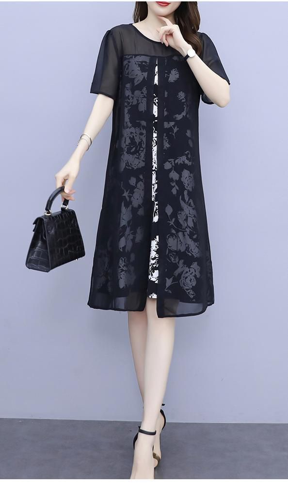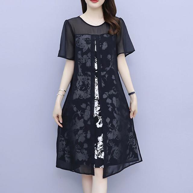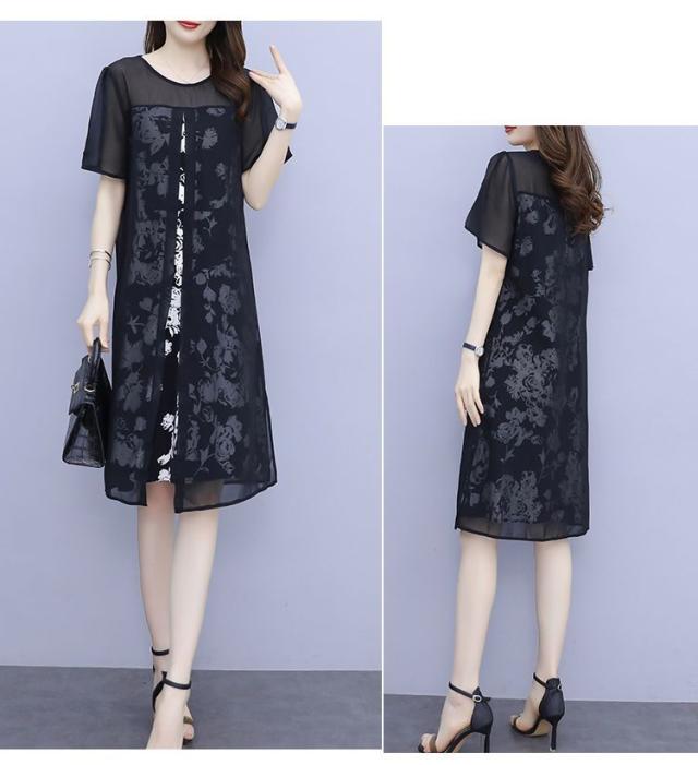 ワンピース プリント柄 ラウンドネック 透け感 重ね着デザイン 大きいサイズ 学校行事 リゾート カジュアルウェア 大人カジュアル 清楚
