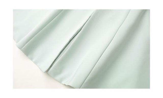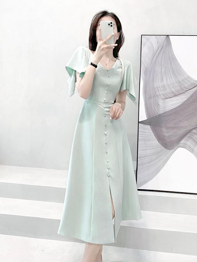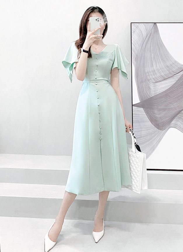 ワンピース 半袖 Vネック ウエストシェイプ ウエストマーク ハイウエスト スリット パステルカラー デザインボタン 袖デザイン 高級