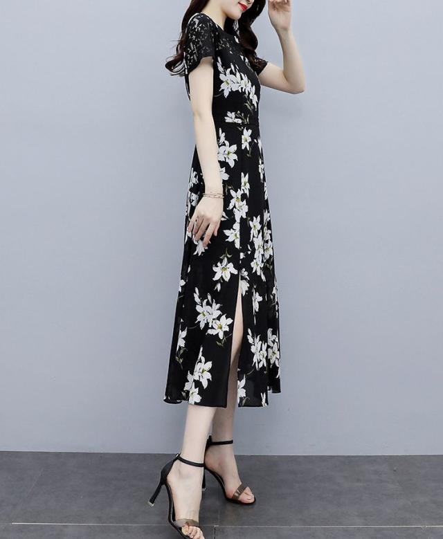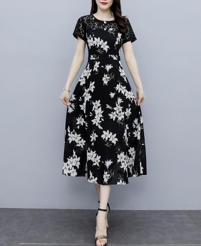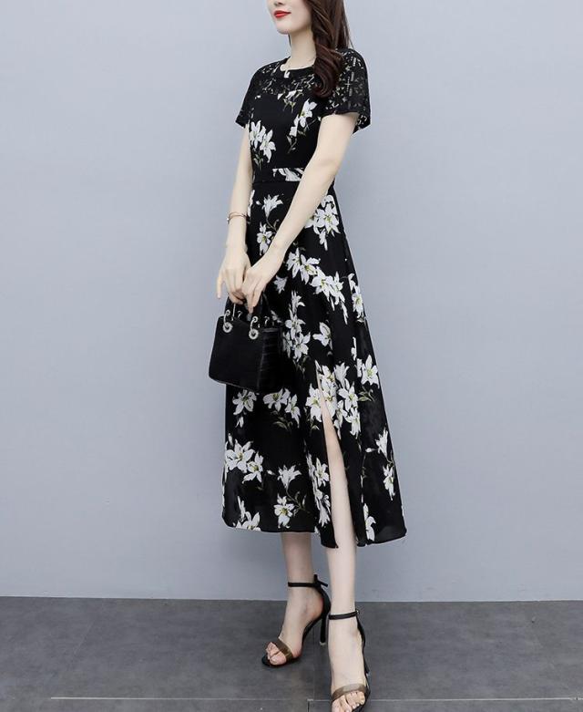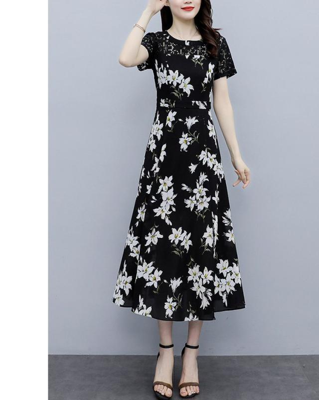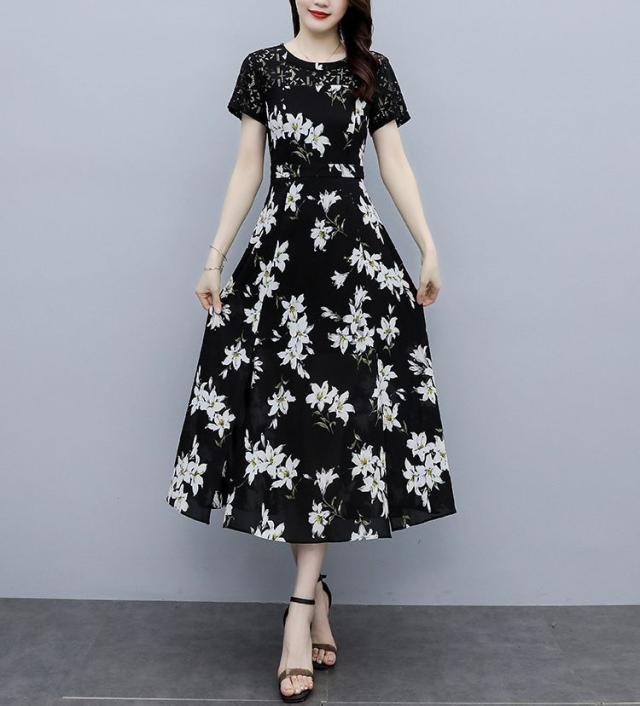 ワンピース ラウンドネック 花柄 半袖 大きいサイズ フェミニン 女子会 上品 清楚 大人可愛い カジュアルウェア ガーリー リモート ドライブ