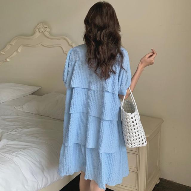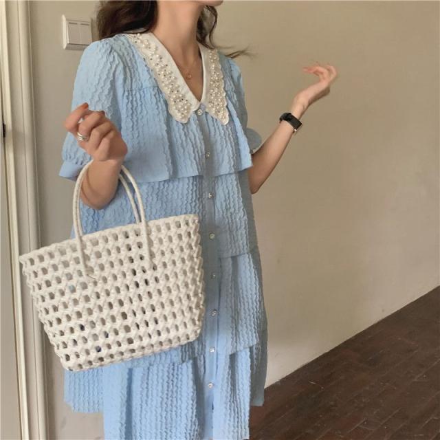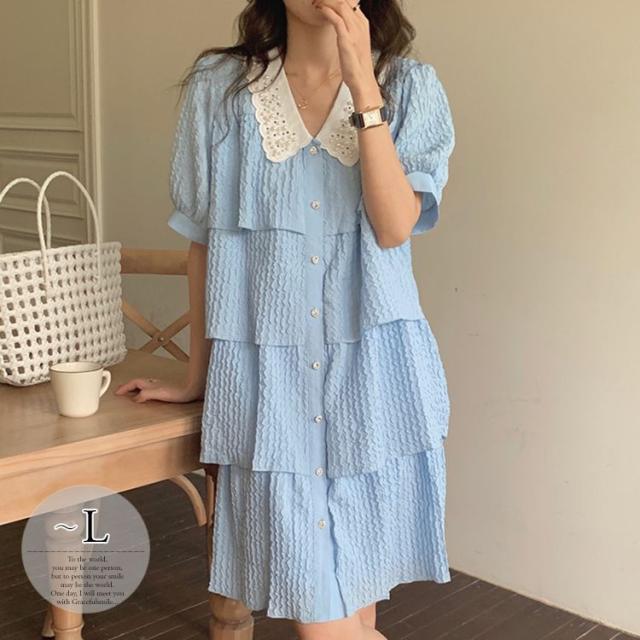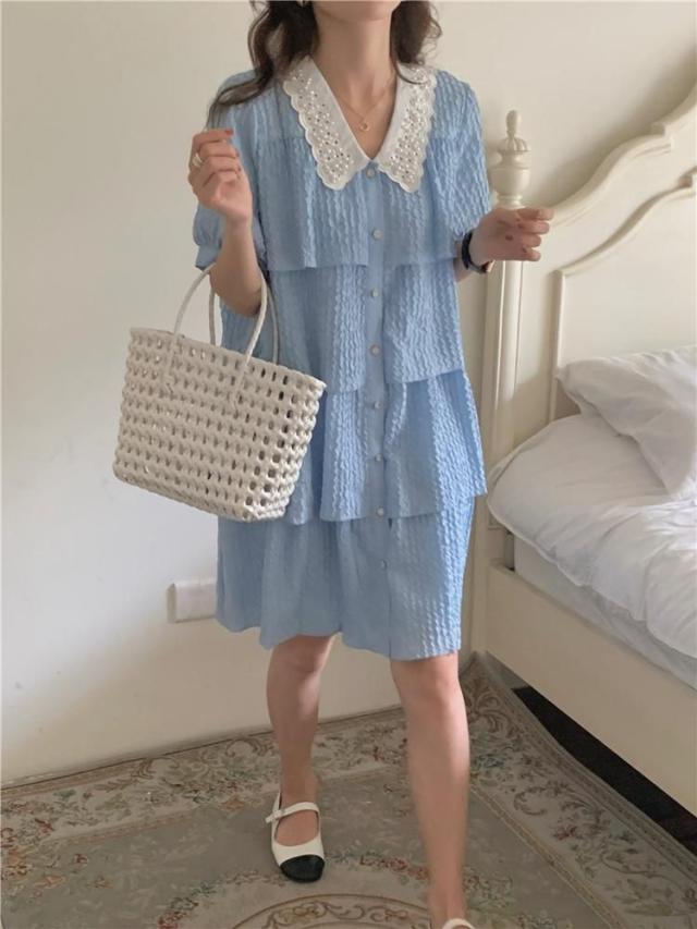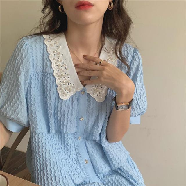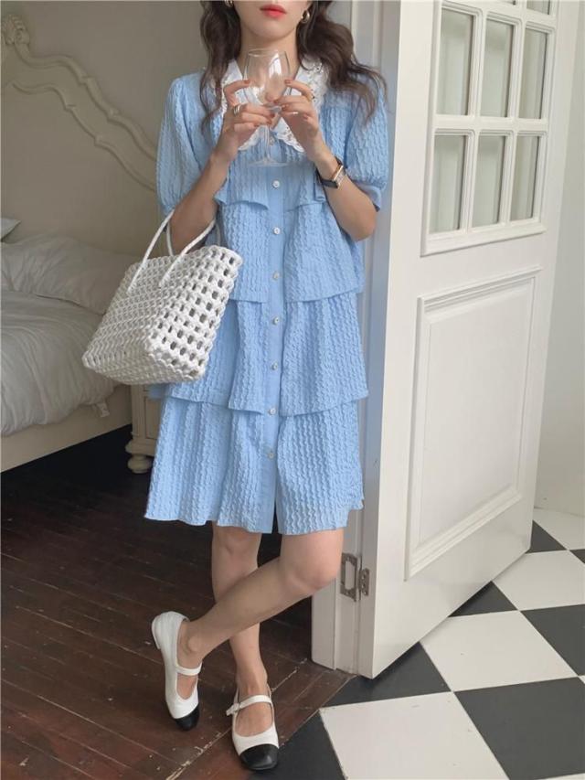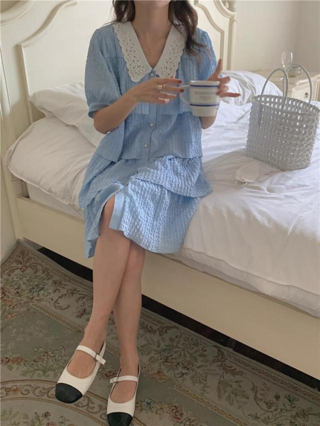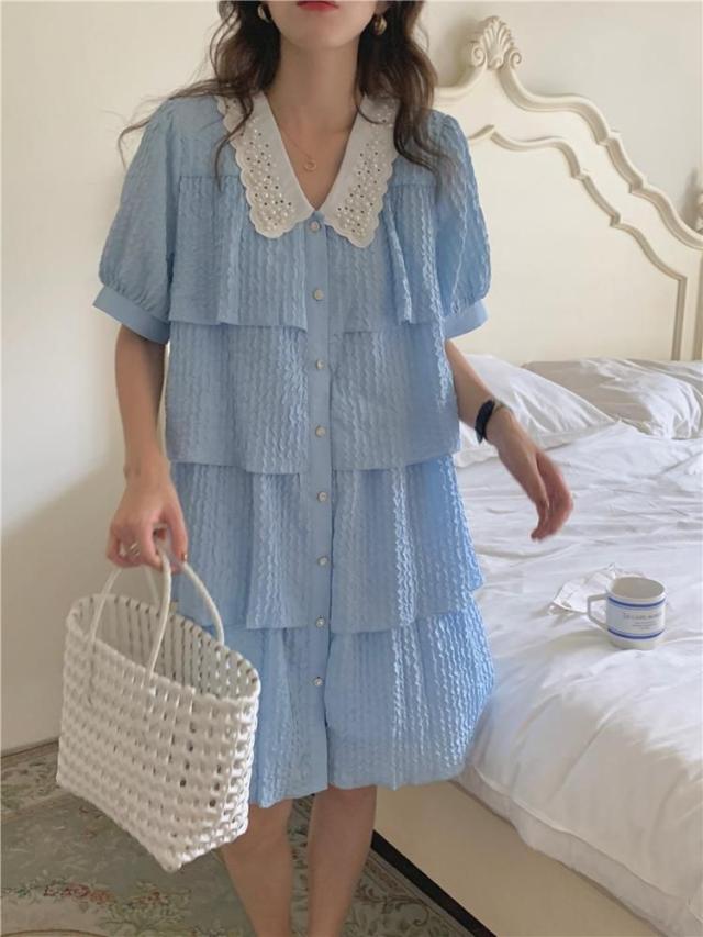 ワンピース 襟付き パフスリーブ 半袖 フロントボタン パール ヨーロピアン 女子会 ドライブ 美人 ガーリー 食事会 お出かけ
