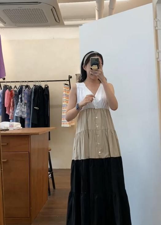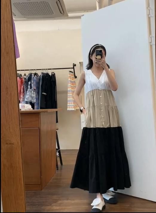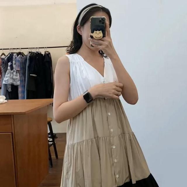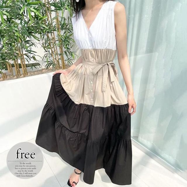 ワンピース サマー ノースリーブ Vネック Aライン ギャザー ウエストリボン フロントボタン ロングワンピース 無地 ナチュラルコーデ 涼しげ