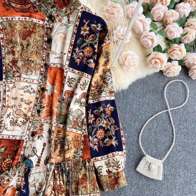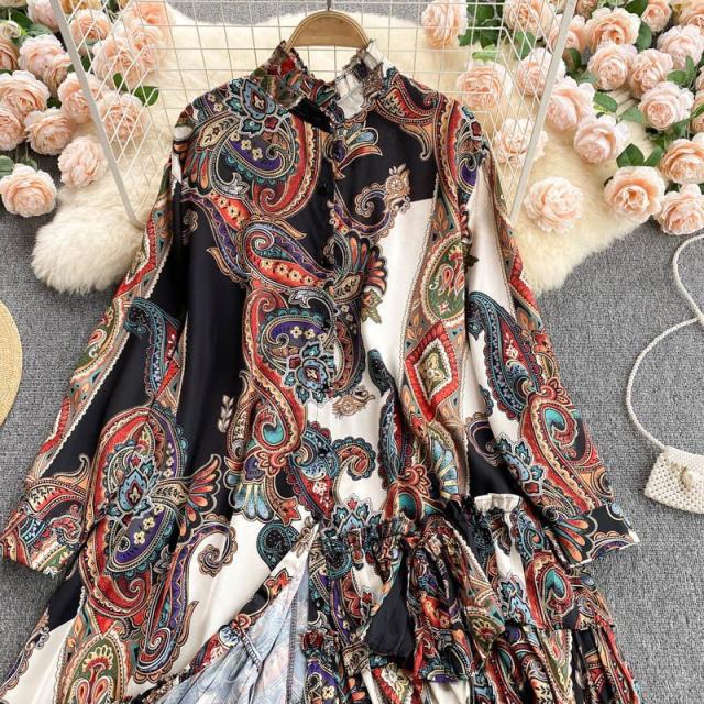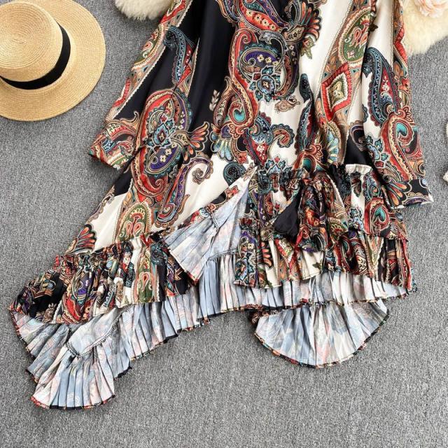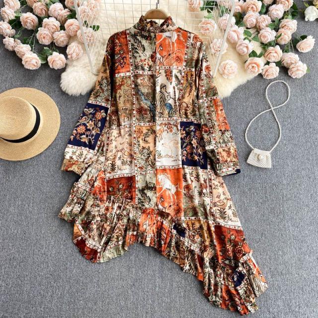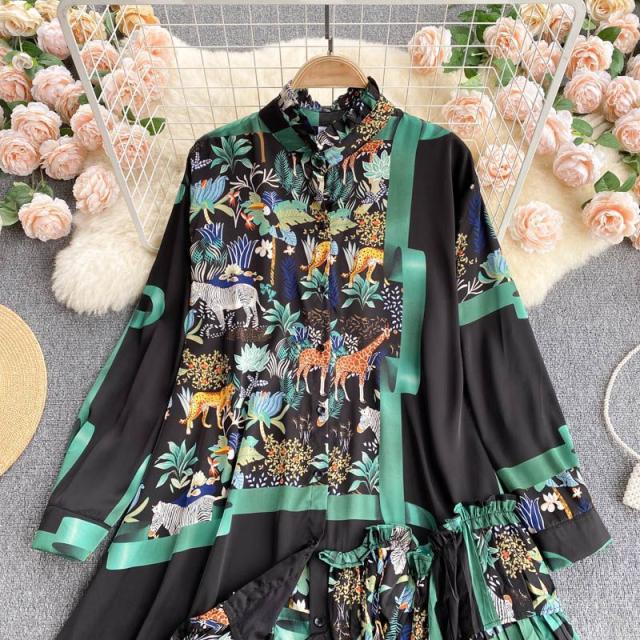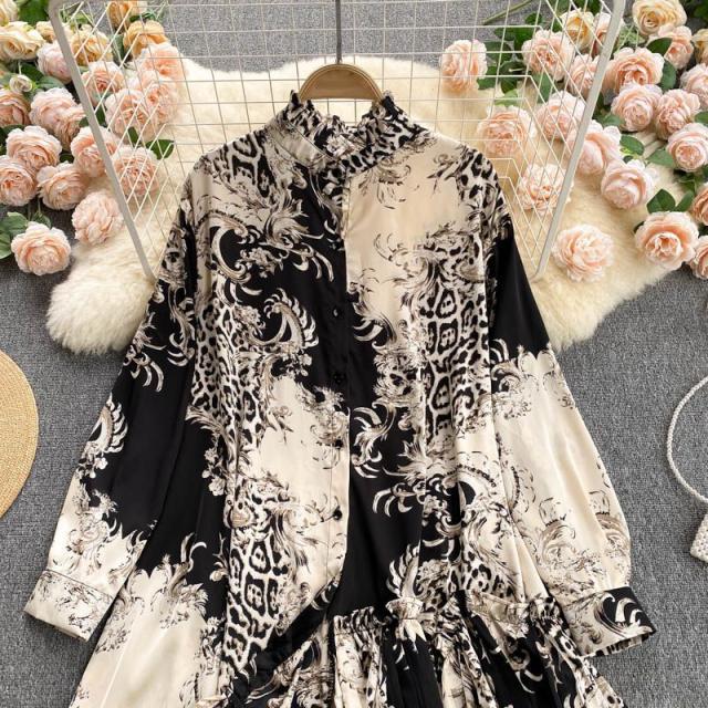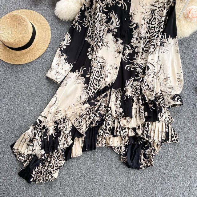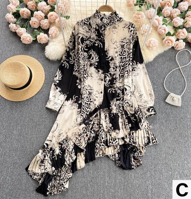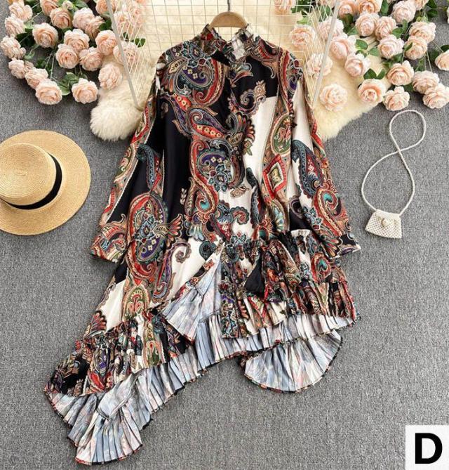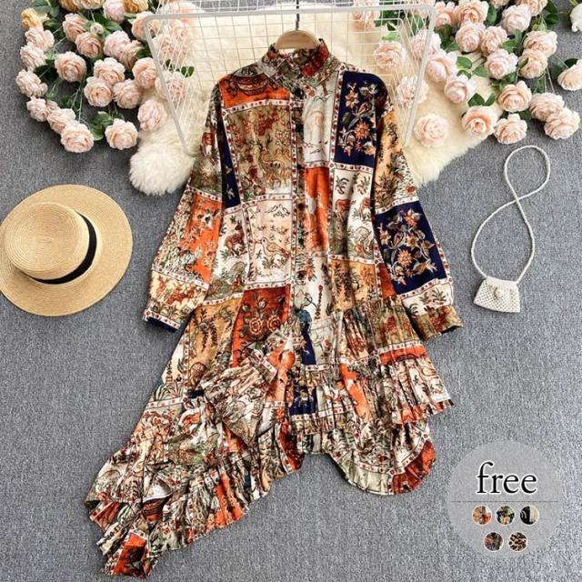 シャツ トップス 総柄 長袖 クルーネック とろみ 首元フリル アシンメトリー フリル フロントボタン クラシカル 休日 リモート 母親