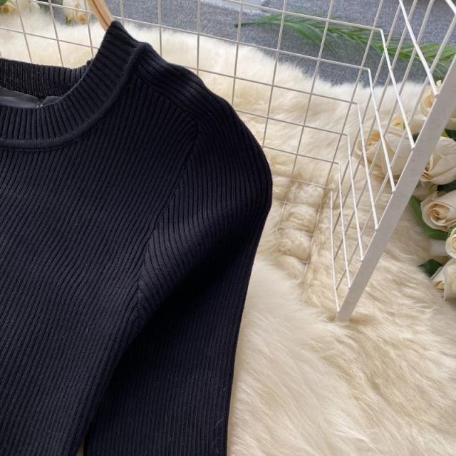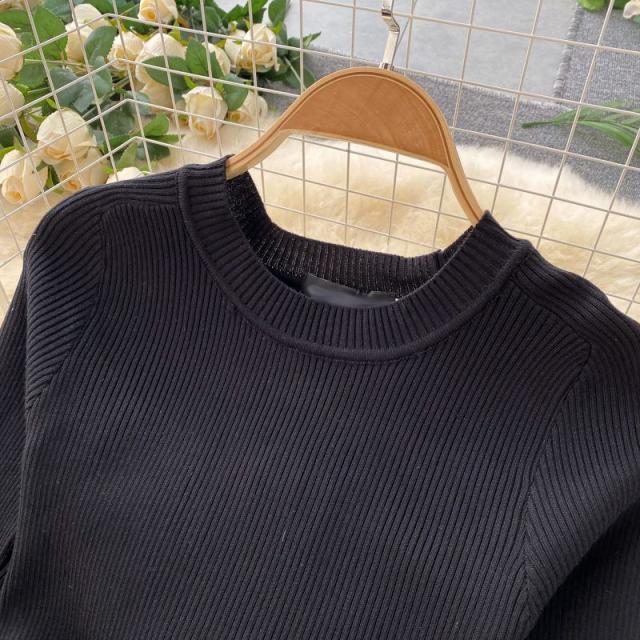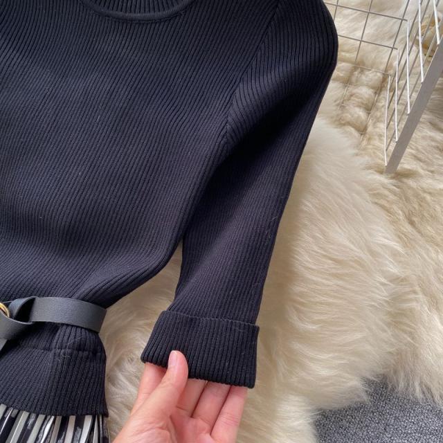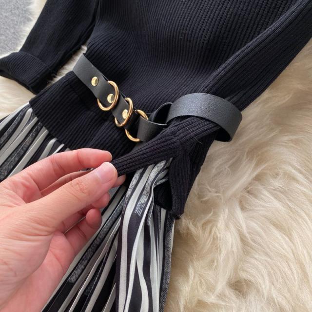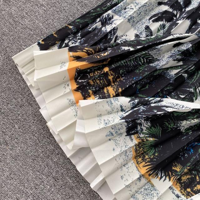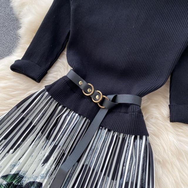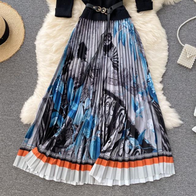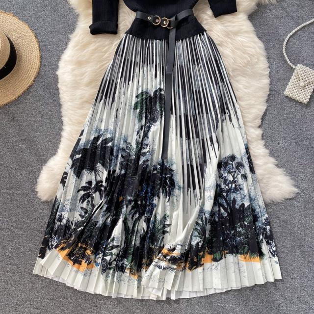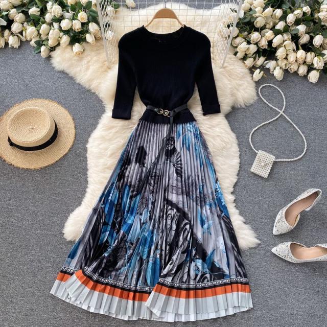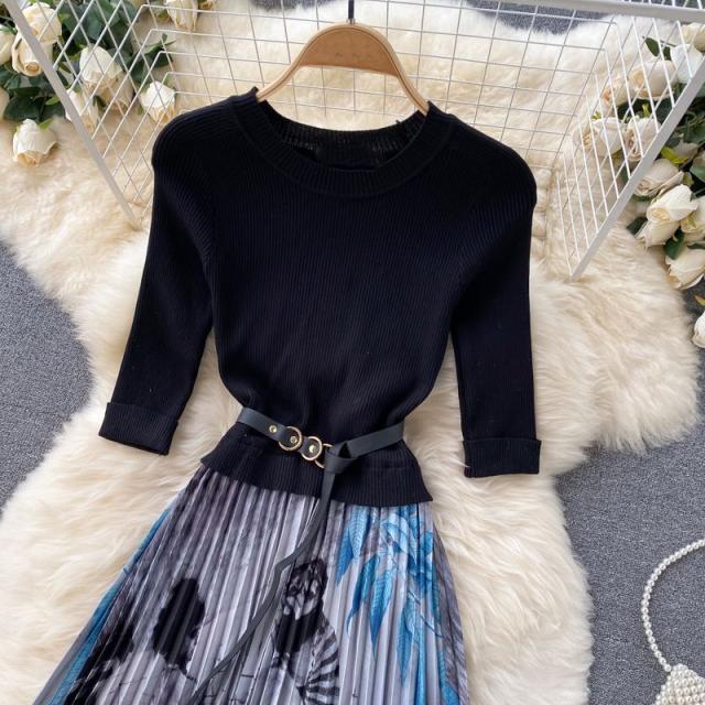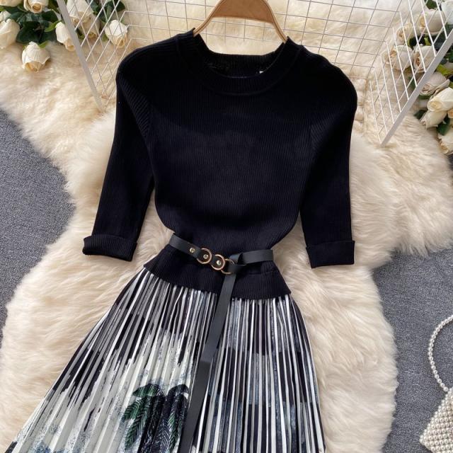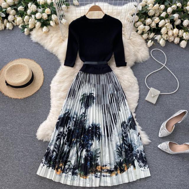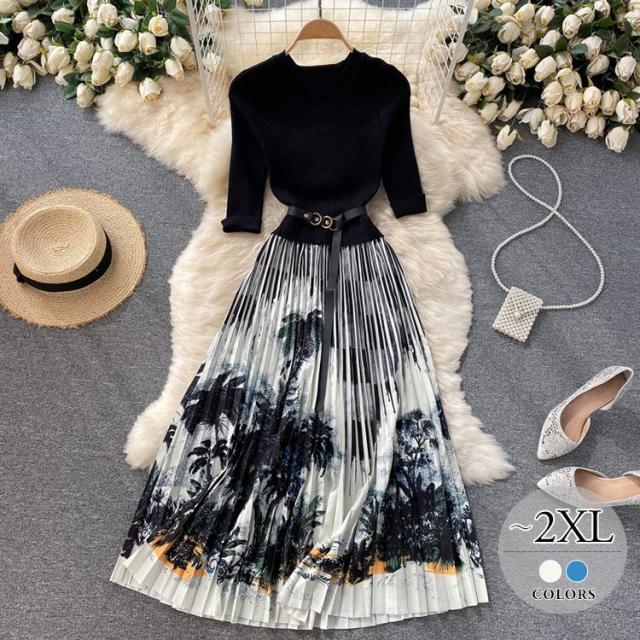 ワンピース サマー プリント柄 ラウンドネック 7分袖 ニット Aライン アコーディオンプリーツ ウエストマーク ロングワンピース ブラック
