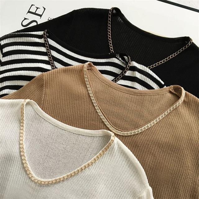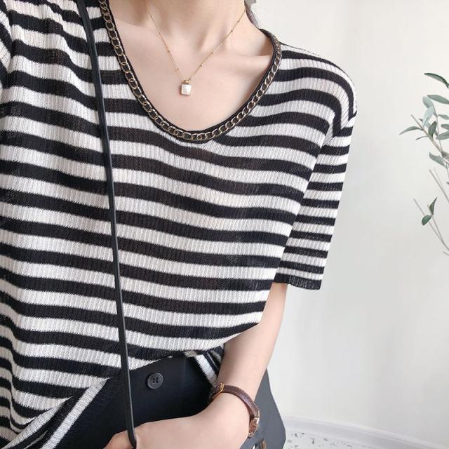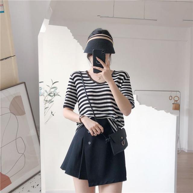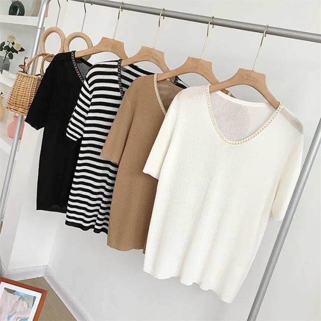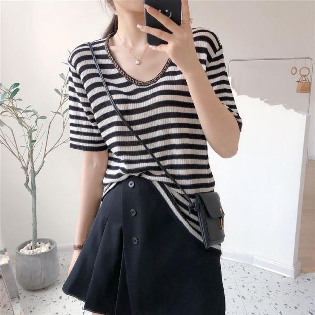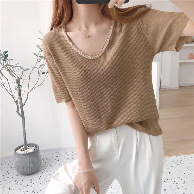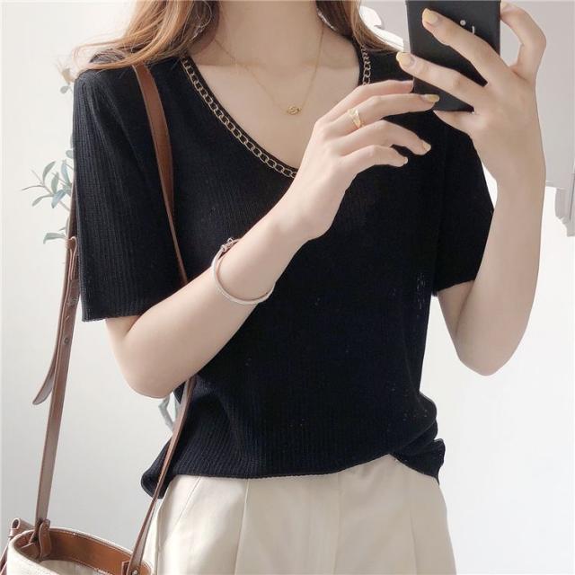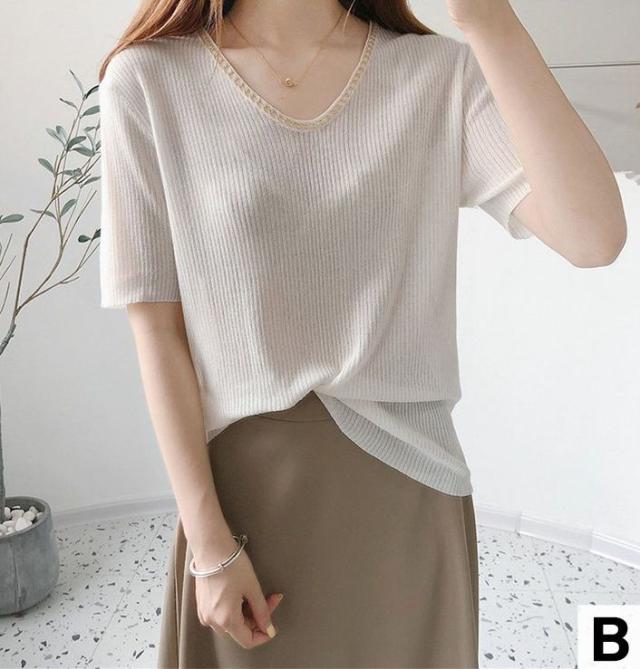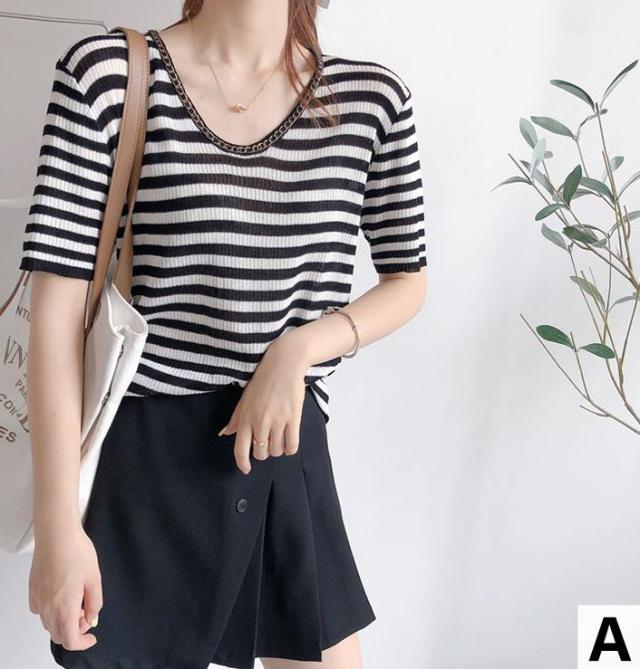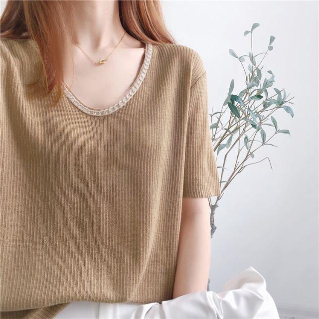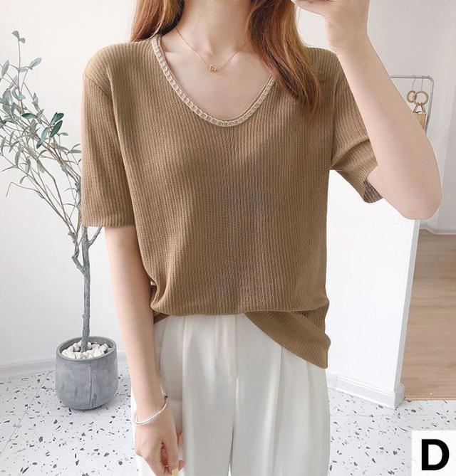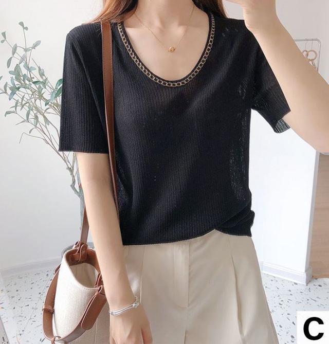 セーター トップス サマー ラウンドネック 半袖 ニット 薄手 ブラック ベーシック オフィスカジュアル ナチュラル お出かけファッション