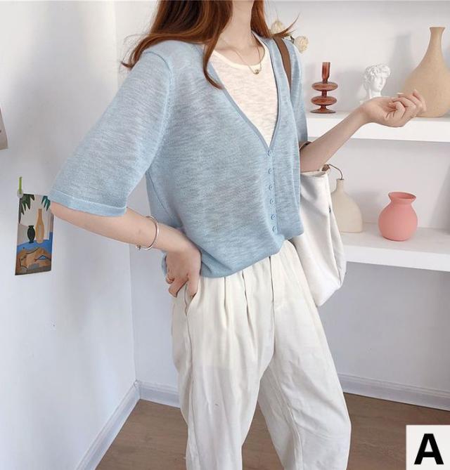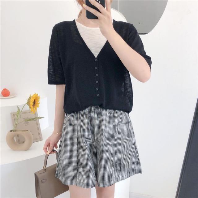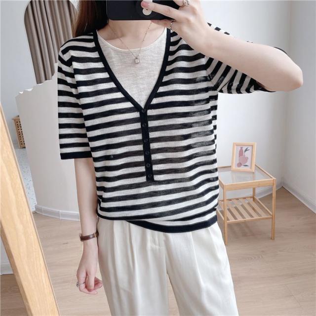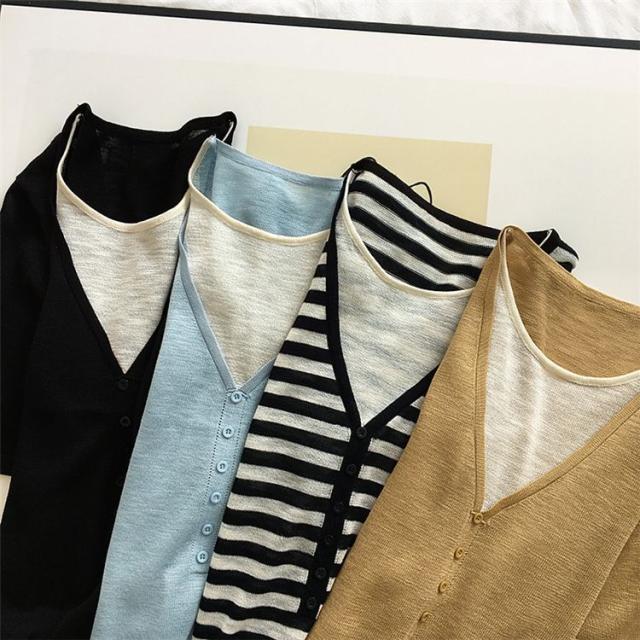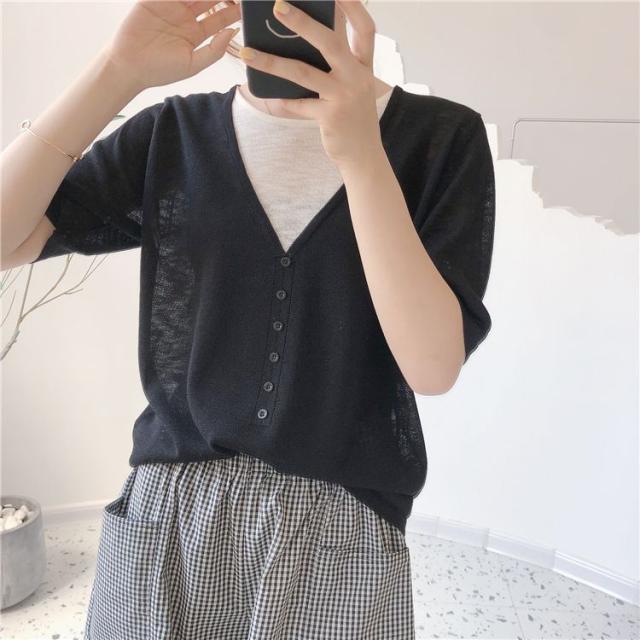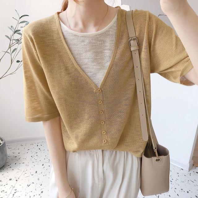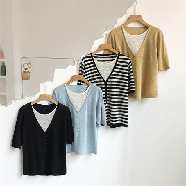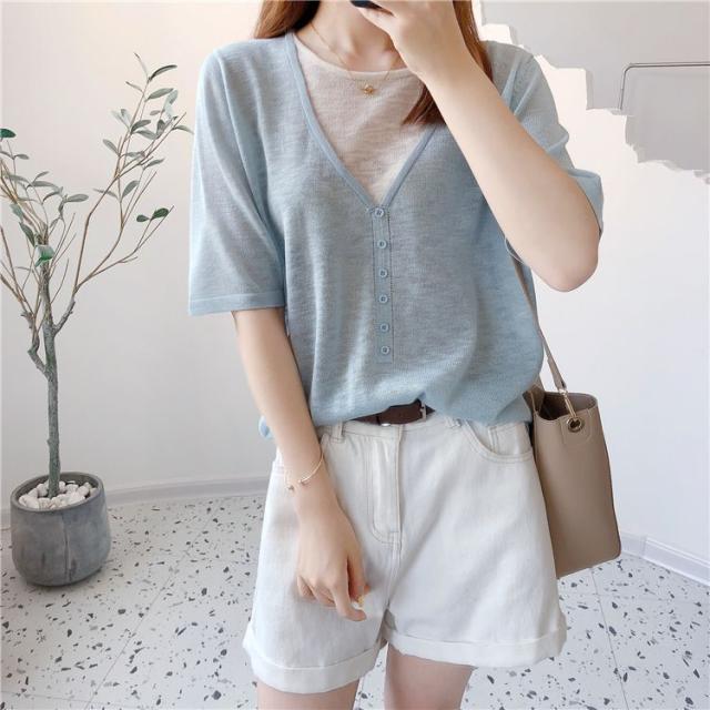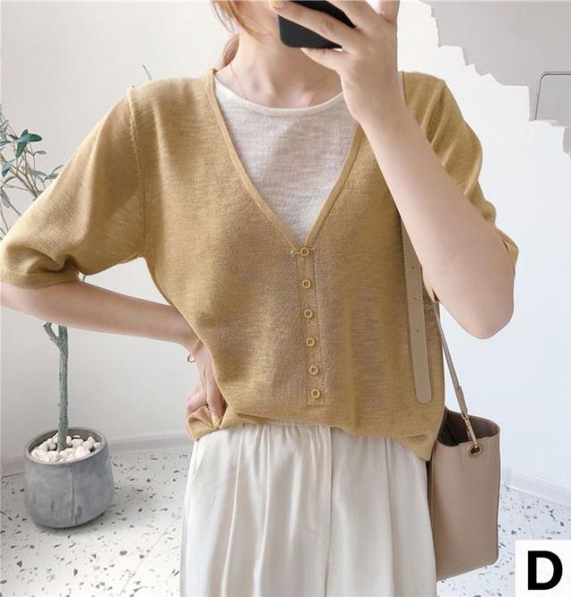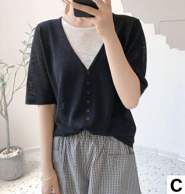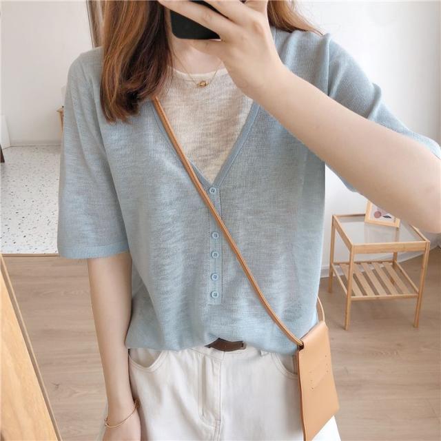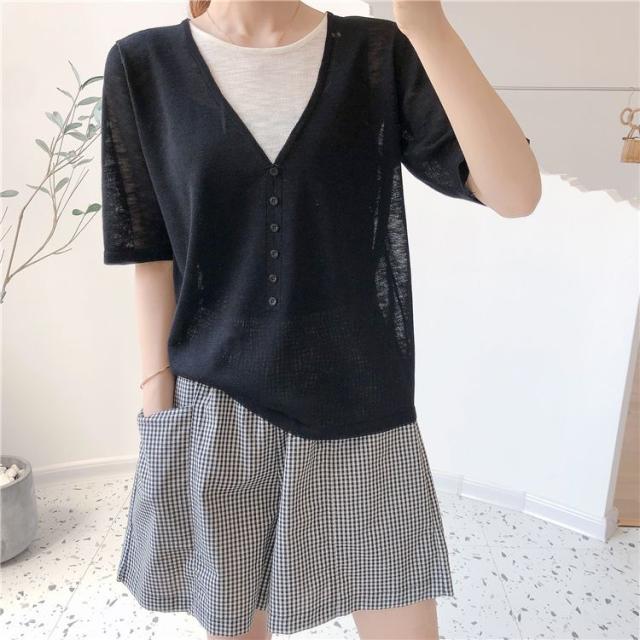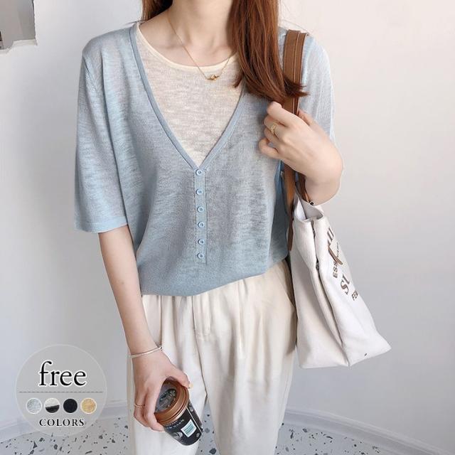 シャツ トップス サマー ラウンドネック 半袖 ニット 重ね着デザイン ブラック 無地 ベーシック ボタン ナチュラルコーデ 涼しげ きれいめ