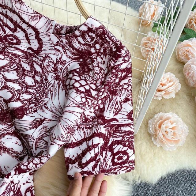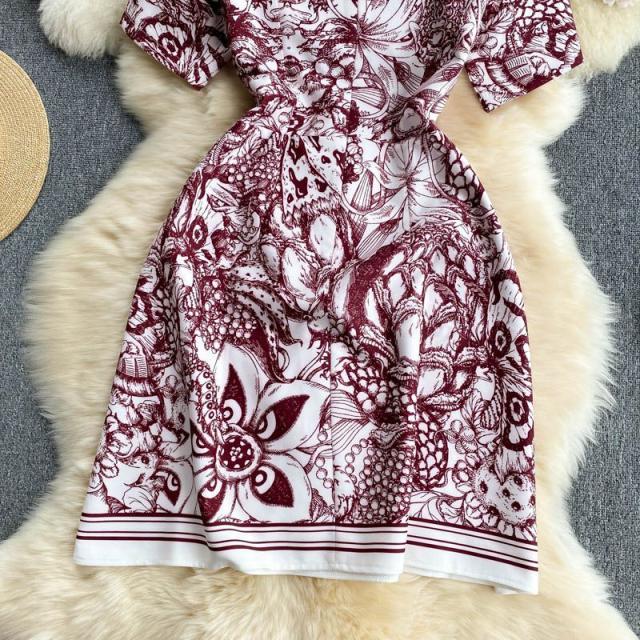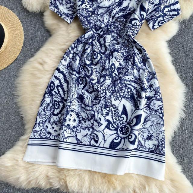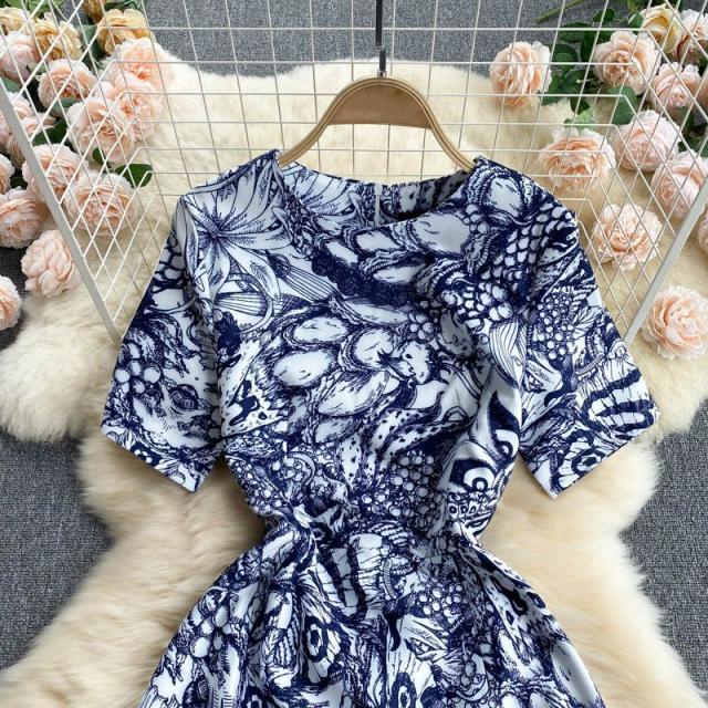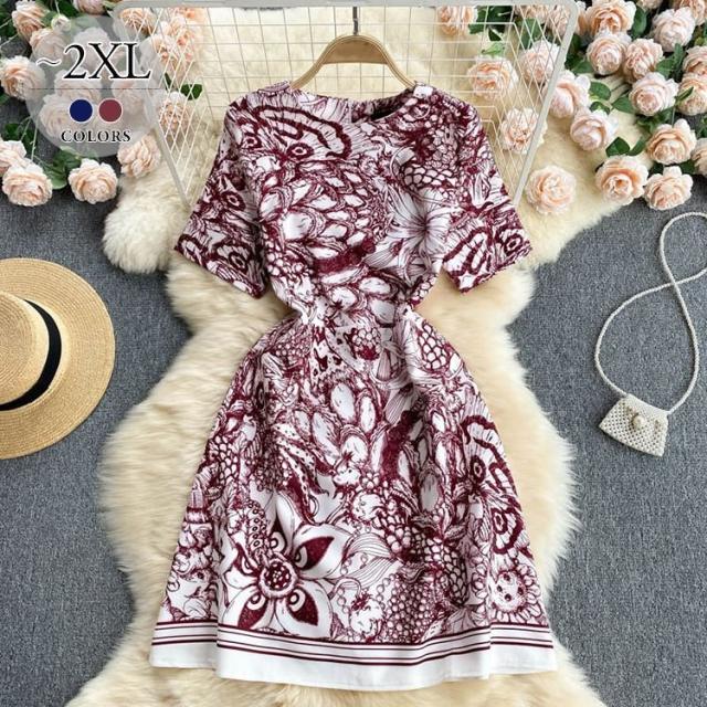 ワンピース ラウンドネック ウエストシェイプ 総柄プリント お出かけ 女子会 大人カジュアル カジュアルウェア 大人可愛い 学校行事 クール