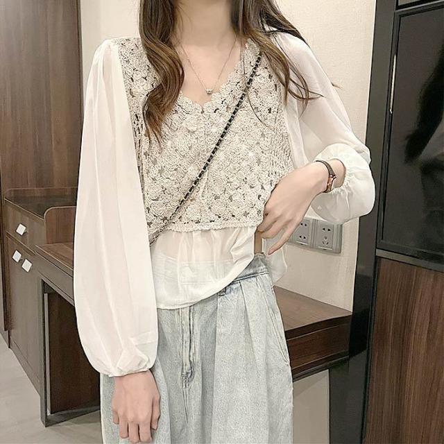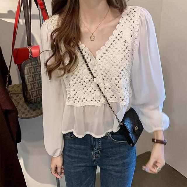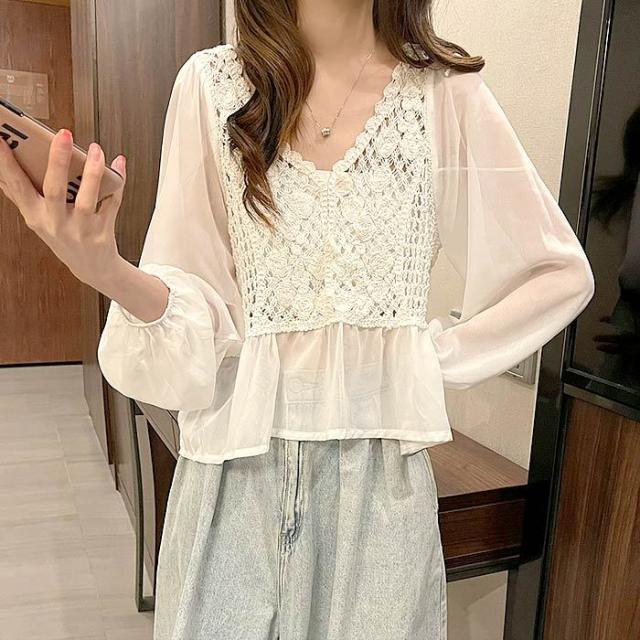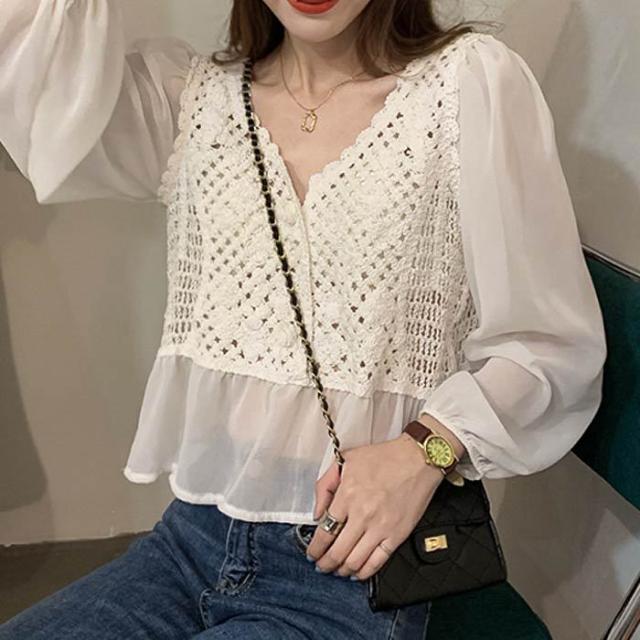 レーストップス バルーンスリーブ シースルー かぎ網トップス 長袖