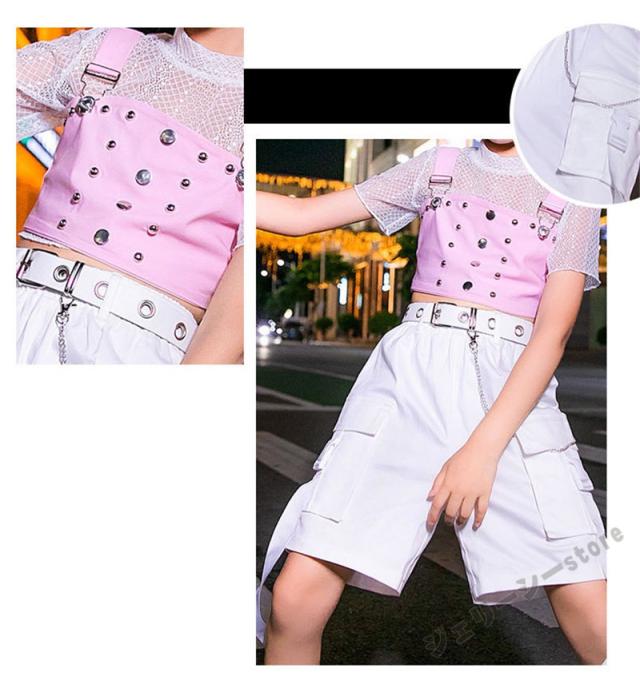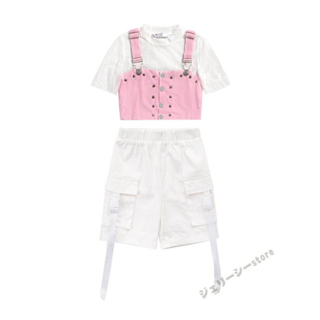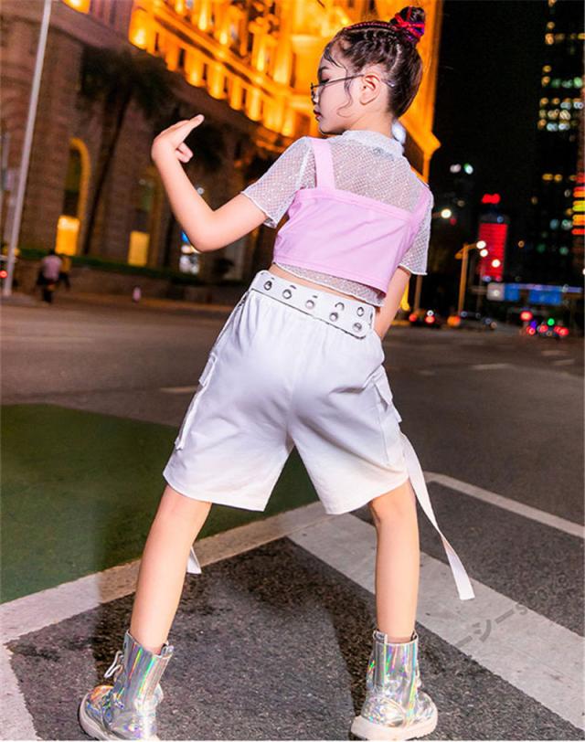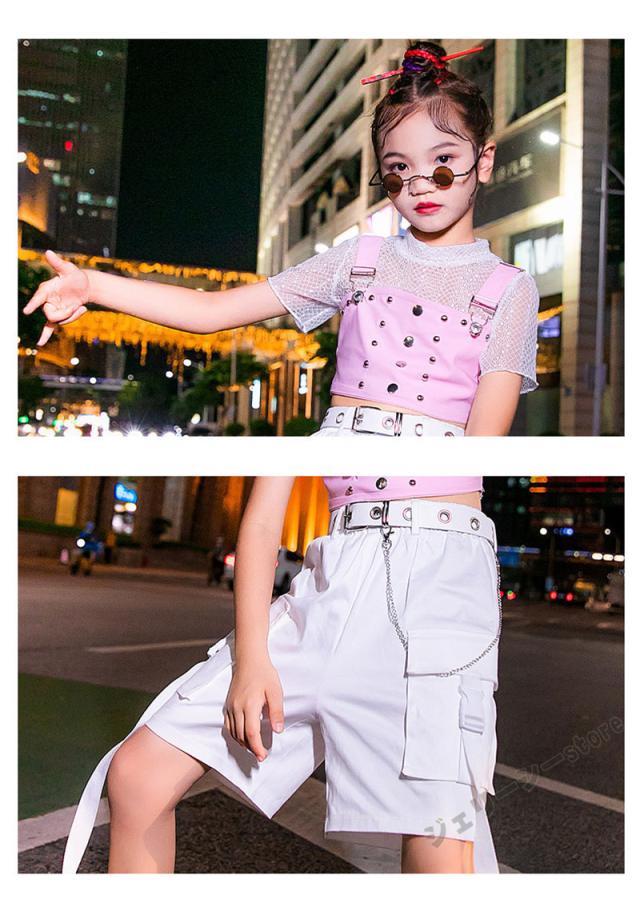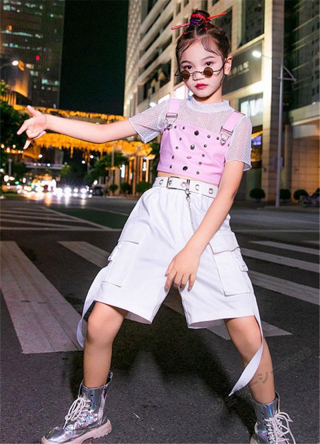 キッズ ダンス衣装 ヒップホップ HIPHOP 子供 女の子 ダンス ホワイト 半袖 ロングパンツ ステージ衣装 練習着 演出服 120-160cm
