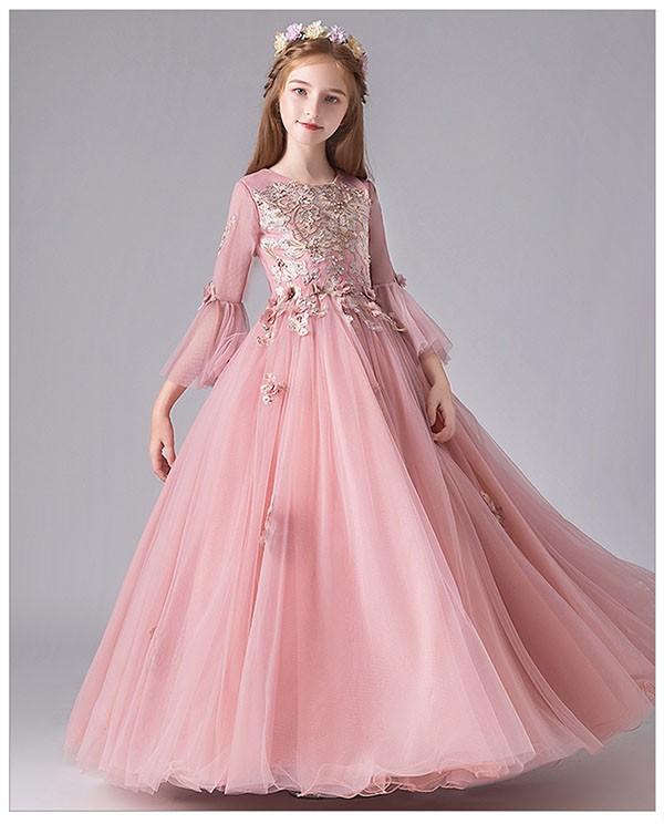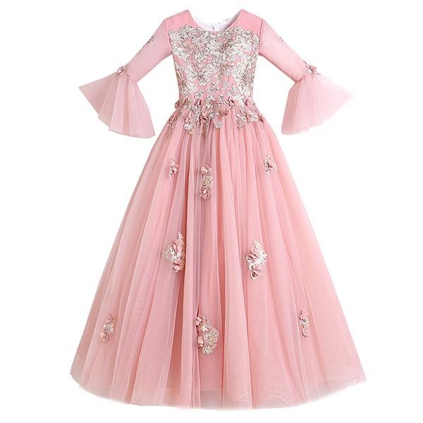 【送料無料】キッズ ドレス 子供服 キッズ服 キッズドレス ピアノ 発表会 結婚式 ワンピース 女の子 袖あり 長袖 フレア袖 ピンク プリンセスライン ロング イベント 演奏会 上品 エレガント 七五三 フォーマルドレス パーティードレス
