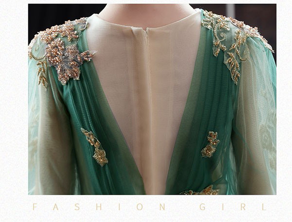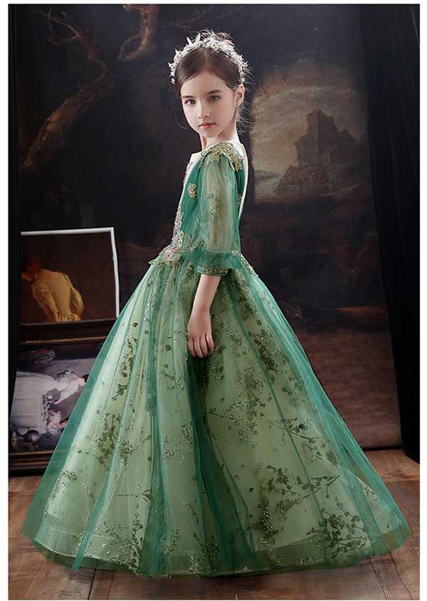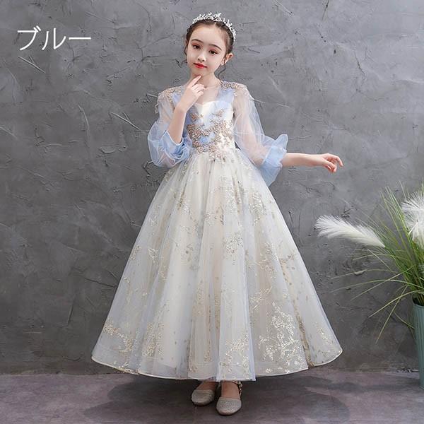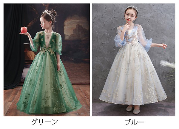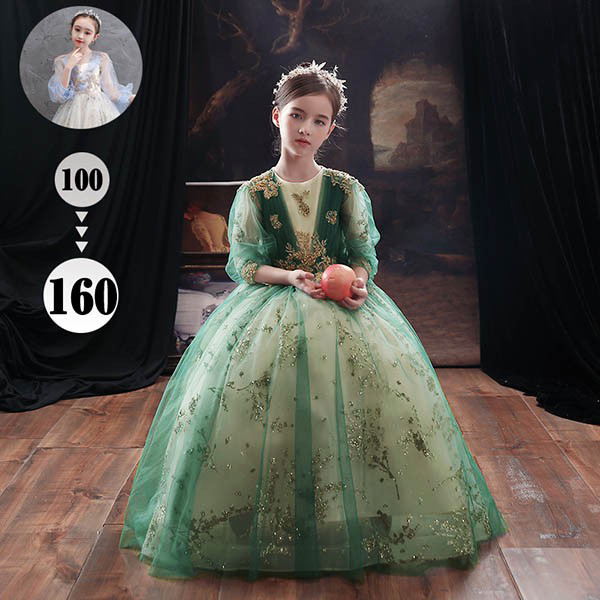 【送料無料】キッズ ドレス 子供服 キッズドレス ピアノ 発表会 結婚式 ワンピース 女の子 ロング丈 長袖 透け感 ポワン袖 クラシカル プリンセスライン ロング 袖あり 演奏会 フォーマルドレス パーティードレス グリーン ブルー