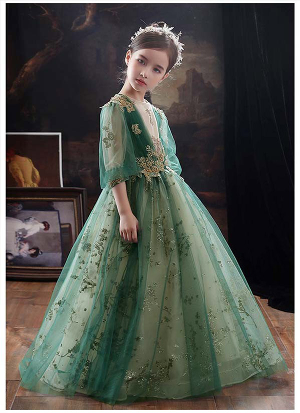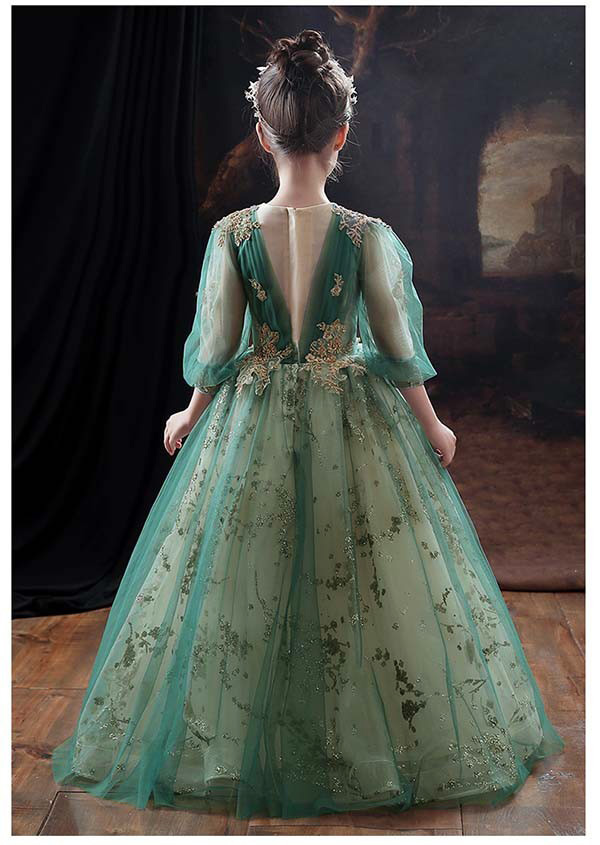 キッズ ドレス 子供服 キッズドレス ピアノ 発表会 結婚式 ワンピース 女の子 ロング丈 長袖 透け感 ポワン袖 クラシカル プリンセスライン ロング 袖あり 演奏会 フォーマルドレス パーティードレス グリーン ブルー 100 110 120 130 140 150 160 da150g5g5x0