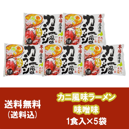 本場北海道カニ風味ラーメン 送料無料 かに カニ 蟹 ラーメン 乾麺 袋麺 味噌味 1食入×5袋 価格 1525円 お取り寄せグルメ 海鮮