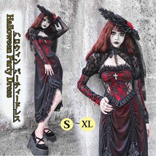 【送料無料】ハロウィン ゴシック キャミソールドレス 仮装舞踏会 女性用 コスチューム 吸血鬼 暗黒風 レース ワンピース 帽子トップス追加可 黒×レッド