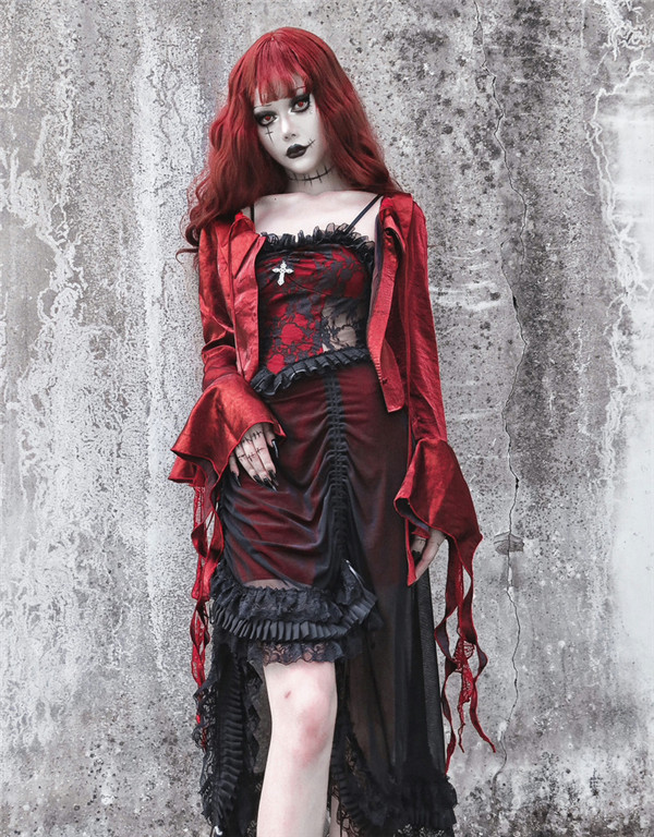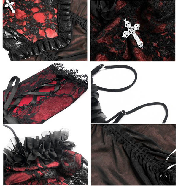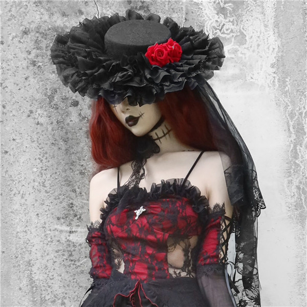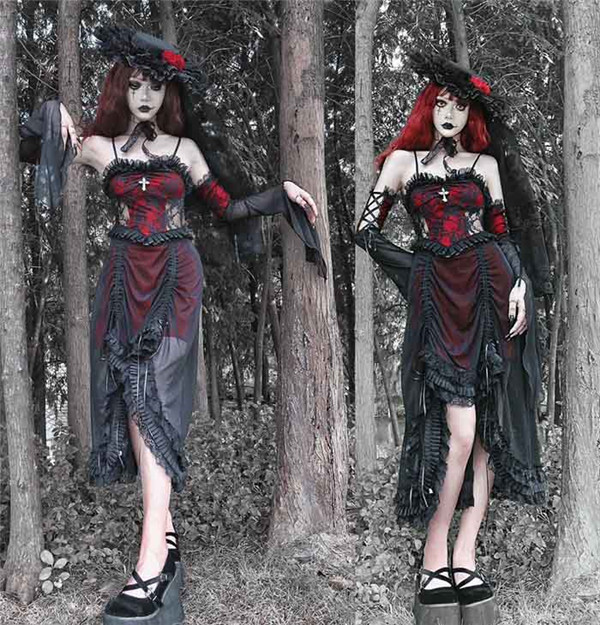 ハロウィン 仮装舞踏会 女性用 コスチューム 吸血鬼 ゴシック暗黒風 レース キャミソールドレス 黒xレッド ワンピース 帽子 トップス追加可 be176c0