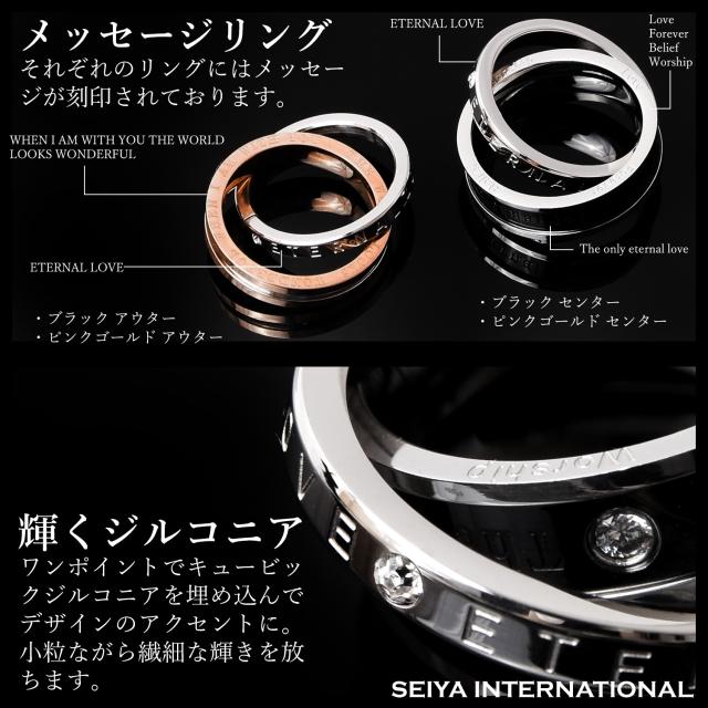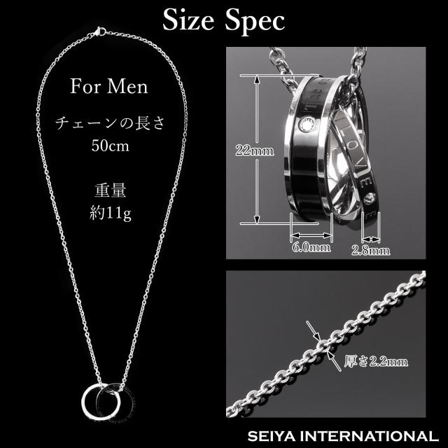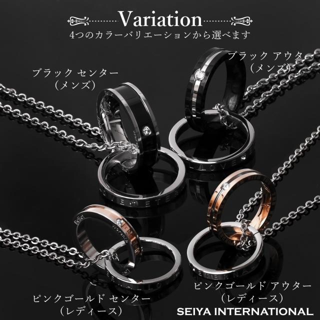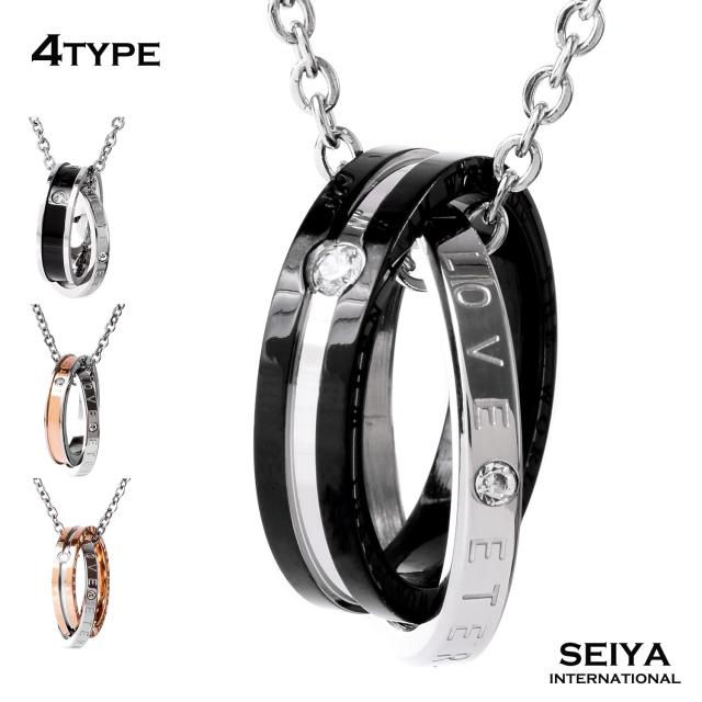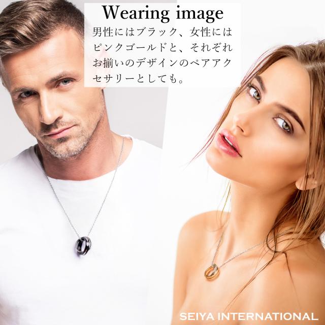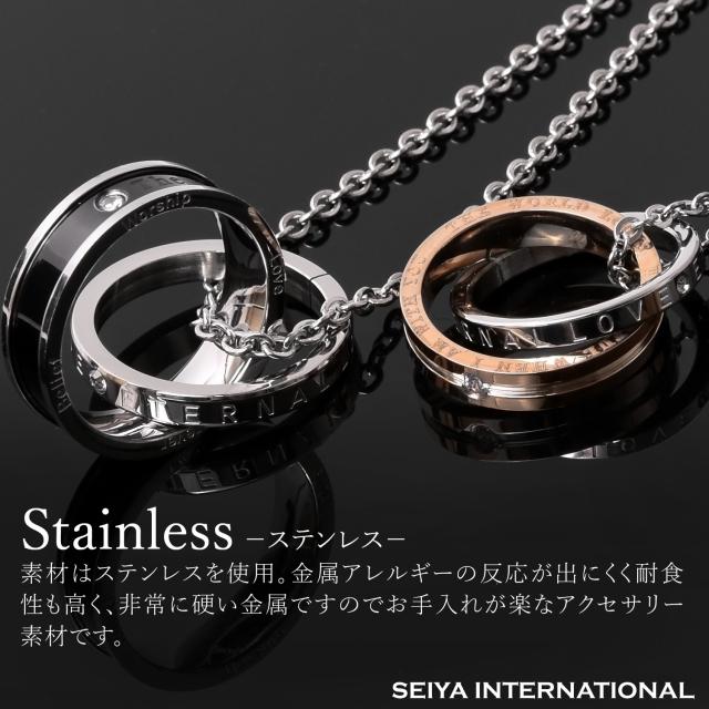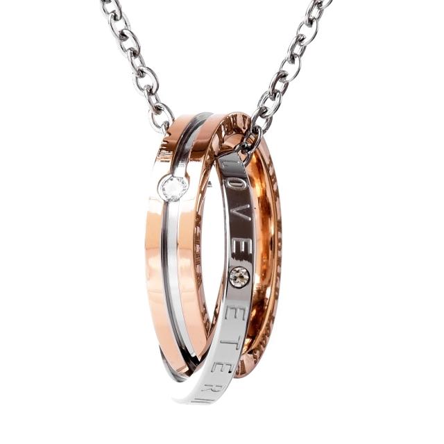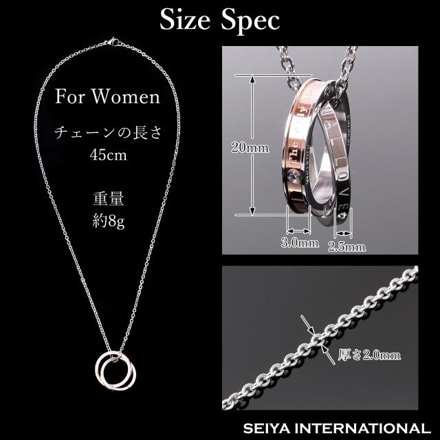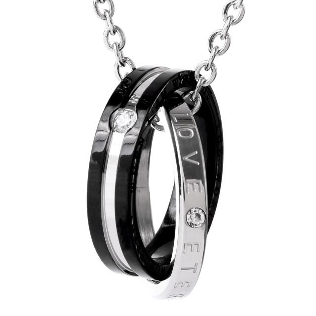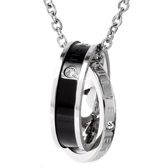 ペアネックレスとは、お付き合いしている相手とお揃いで着けるネックレスです。お揃いで着けるジュエリーと言えばペアリングを思い出す方が多いかも知れませんが、実はペアネックレスも人気の高いアクセサリーです。シルバーのリングにはETERNAL LOVE(永遠の愛)が刻まれ、ブラック、ピンクゴールドの2つのリングを交差させることで、2人の永遠を演出するダブルリング。メンズにはシックでかっこいいブラック、レディースには華やかなピンクゴールドのリングがお勧めです。ペアネックレスとして、カップルでお揃いでつけるのも人気のネックレスです。