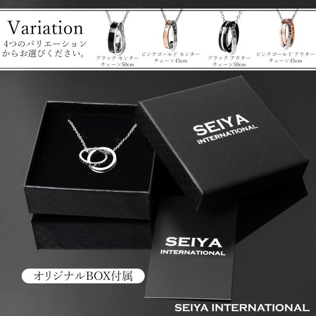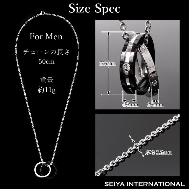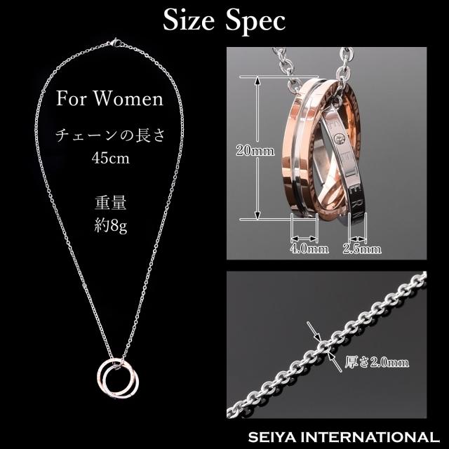2個のリング本体にはきらりと輝くキュービックジルコニアが、天然ダイヤモンド のように輝き透明感と高級感を演出してくれます。CZダイヤ(キュービックジルコニア)は透明で屈折率がダイヤモンドに近い為、代替品としてジュエリーやアクセサリーに用いられています。非常に美しい輝きを放ち、貴方の魅力をより一層引き出します。ステンレスにすることにより高級感のある輝きを表現し、ブラック、ピンクゴールドそれぞれの色が一番映える素材にしました。シンプルなデザインが多いネックレスの中、存在感抜群のこのリングネックレスはあなたの胸元でおしゃれに輝きます。
