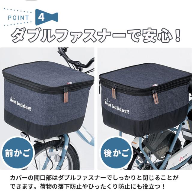| 商品説明 | ・自転車での通勤時や、お子様の送り迎えの時にも大活躍!大切な荷物を雨やひったくりから守る、自転車用2段式デニム調カゴカバー。前カゴカバーと後ろカゴカバーのお得なセット。 ・荷物が少ないときはすっきり!多いときにはたっぷり収納!前カゴカバー、後ろカゴカバーともに、その日の荷物の量に合わせてファスナーを開放することで、2段式に容量アップ。 ・電動アシスト車など、大型の前カゴ・後ろカゴにも対応するワイドサイズ。 ・【カゴ対応サイズ】(※細かいメッシュタイプのカゴには取り付けできません。) ・前カゴカバー・・・横幅:約40cm×奥行:約32.5cm×高さ:約30cmの前カゴに装着可能。 ・後ろカゴカバー・・・横幅:約33cm×奥行:約43.5cm×高さ:約26cmの後ろカゴに装着可能。 ・カバー背面のゴム(※)と、裾のドローコードで、前後のカゴにしっかりとフィット。(※装着時、後ろカゴカバーの背面ゴムの位置は自転車のサドル側になります。) ・スタイリッシュなデニム調生地には、水滴をしっかり弾く厚手のはっ水加工生地を採用。突然雨に降られた時も荷物が雨に濡れるのを防ぎ、帰宅後にタオルでサッと拭くだけでお手入れも簡単! ・カバーの開口部はダブルファスナーでしっかりと閉じることができるので、ひったくり防止にも役立つ!(※ひったり抑止には効果がありますが、防犯上絶対ではありません。貴重品の管理はお客様ご自身で行ってください。) ・ファスナーは前開き・後ろ開き、どちらからでも開閉できる両開きタイプで使い勝手も抜群。 ・「Best Holiday!!」のロゴがデザインのワンポイント!晴れの日も雨の日も、自転車でのお出掛けが快適! |