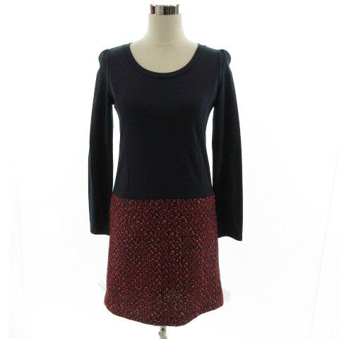 【中古】チェスティ Chesty ワンピース ひざ丈 長袖 Uネック ツイード調 バックリボン 切替え ネイビー 紺 赤 1