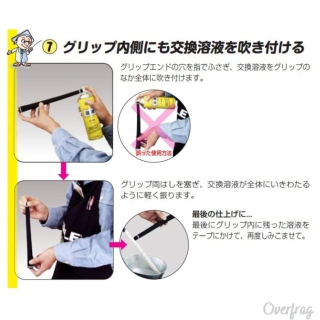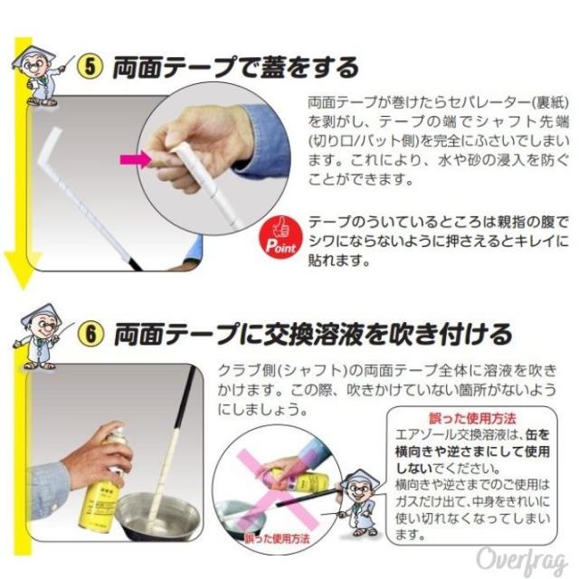 グリップ交換に必要な両面テープ 長さ10m とエアゾールタイプの交換溶液 100ml 交換可能8-12本分と太いシャフトや細いグリップでも簡単に入れられるスターターのセット。