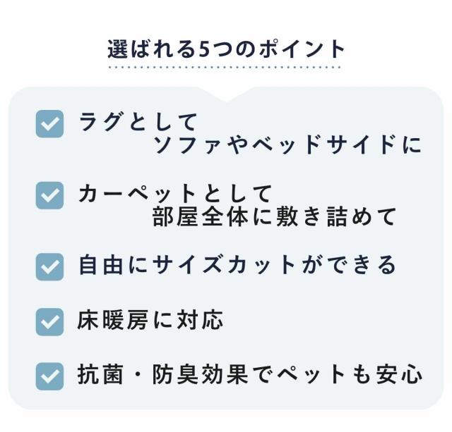 均一なループで程良い弾力があり、へたりづらいので長く使えます。ふかふかとした肌触りが特徴で、人が集まるリビングなどにオススメです。お掃除ロボにも対応しています。