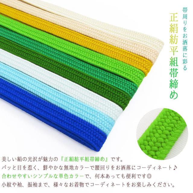 【2本までメール便送料無料】高級 正絹紡平組紐 平組 帯締め 絹100% 伝統的工芸品 手組 巾1.2cm 並尺 約153cm 手組紐 9色 カラフル 黄 青 緑 和装小物 着付け小物 レディース 女性 通年用 お洒落 カジュアル 着物 訪問着 付け下げ 色無地 小紋 紬 振袖 成人式 卒業式