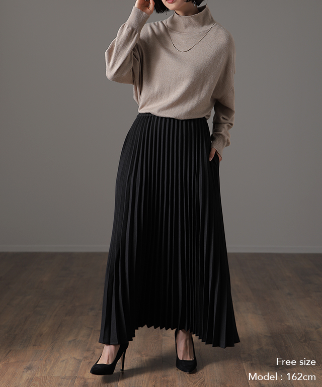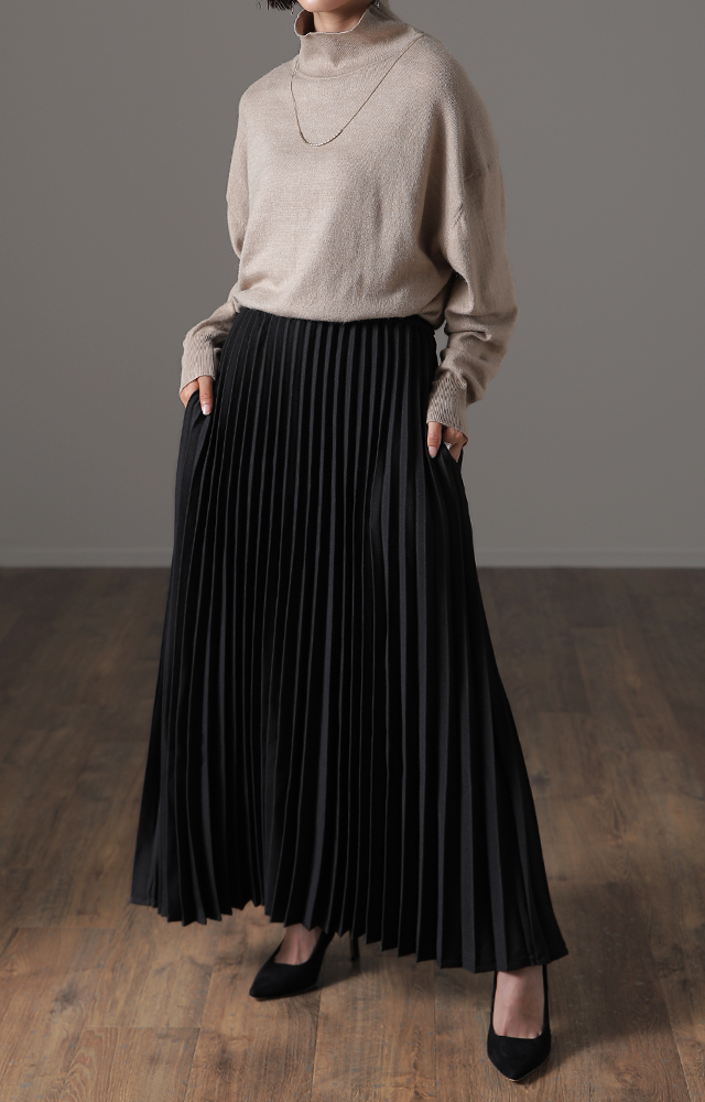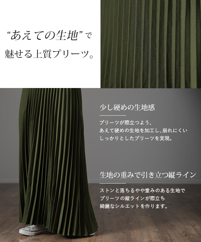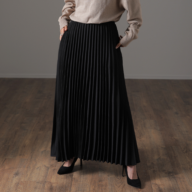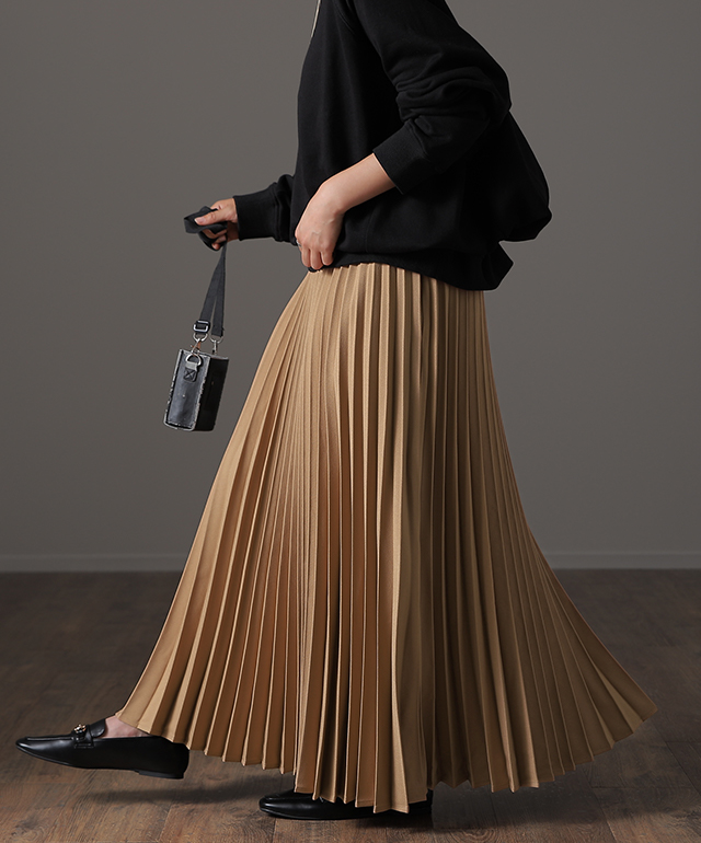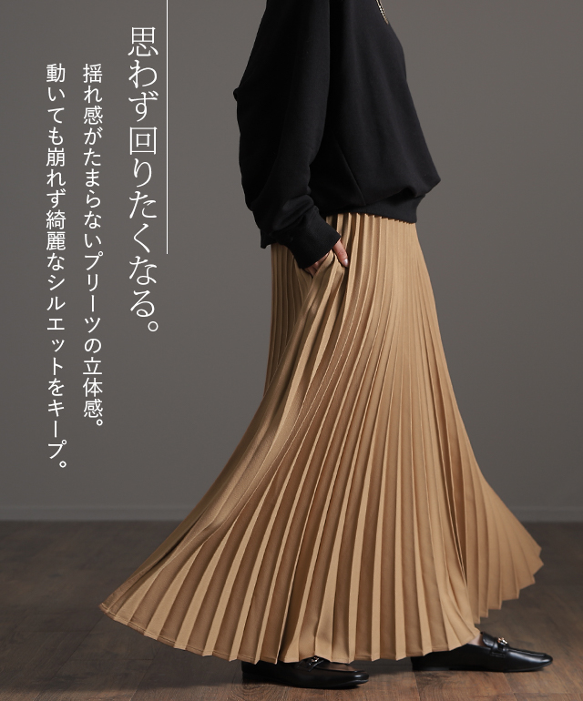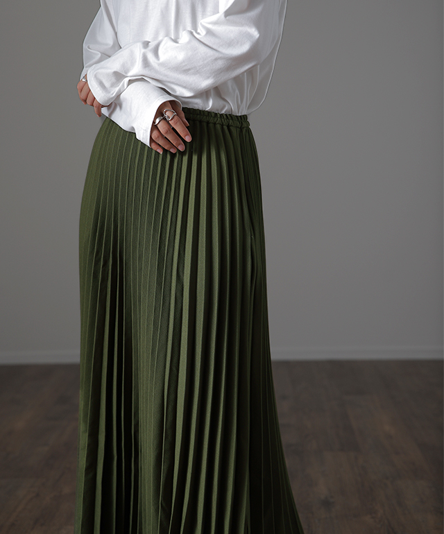 広がり過ぎないシルエットとプリーツの縦ライン効果ですっきり体型カバーも。