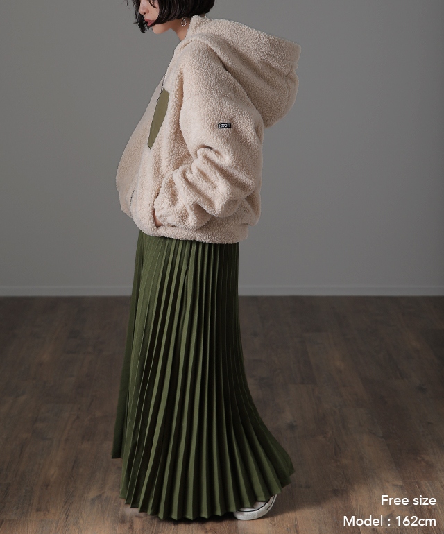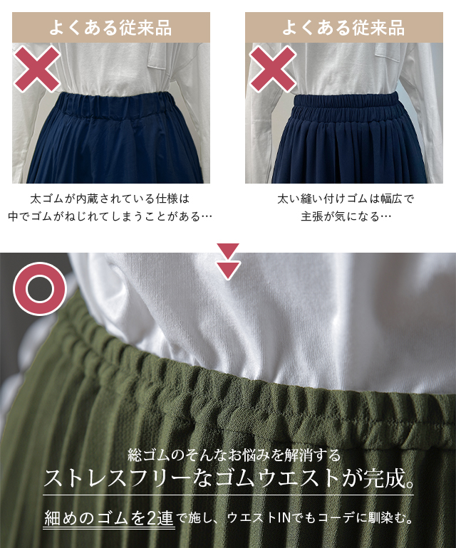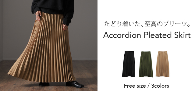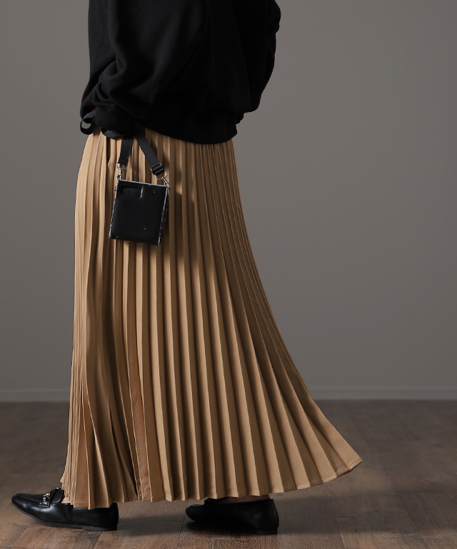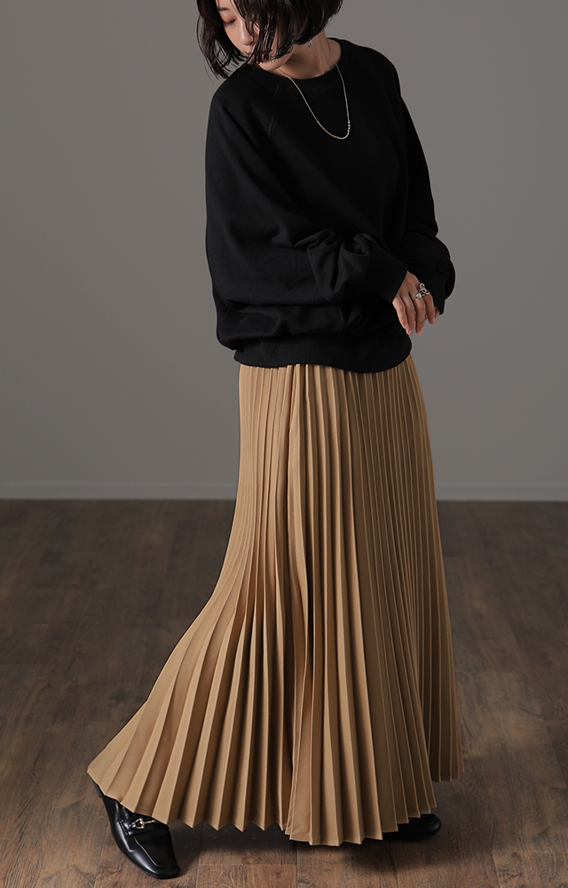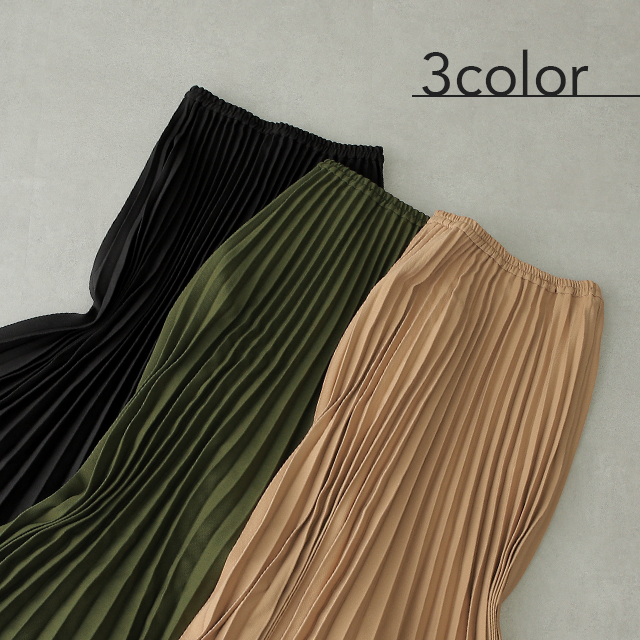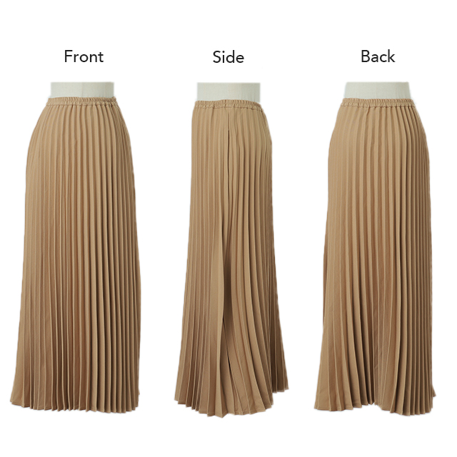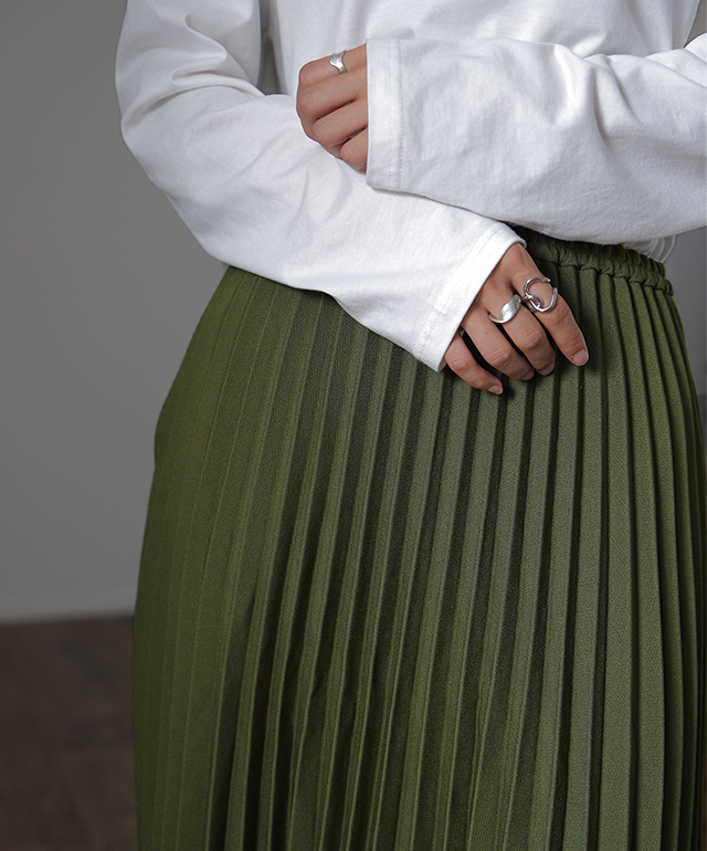 広がり過ぎないシルエットとプリーツの縦ライン効果ですっきり体型カバーも。