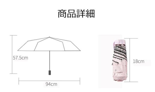 | サイズについての説明 | *骨の本数:6本 *収納時全長: 5段折18cm *開く時直径:94cm *重さ:約220g |