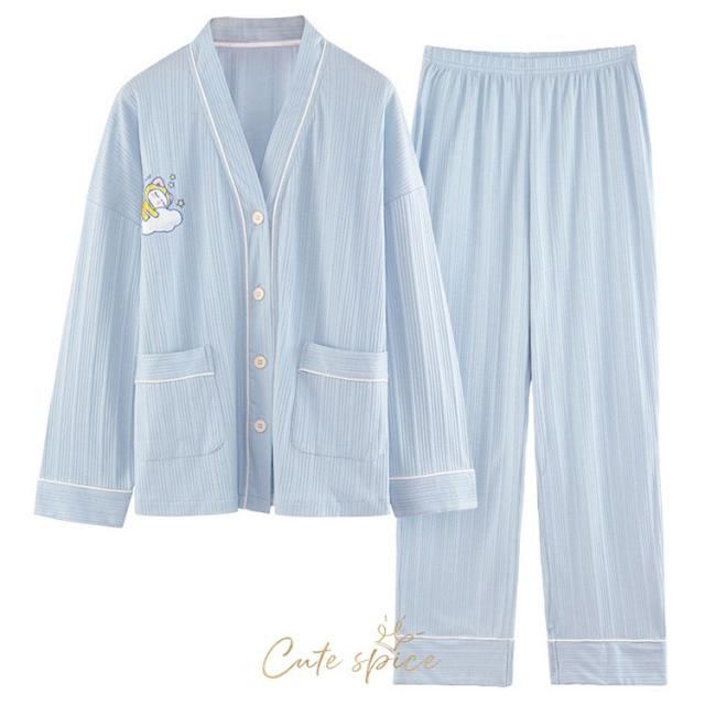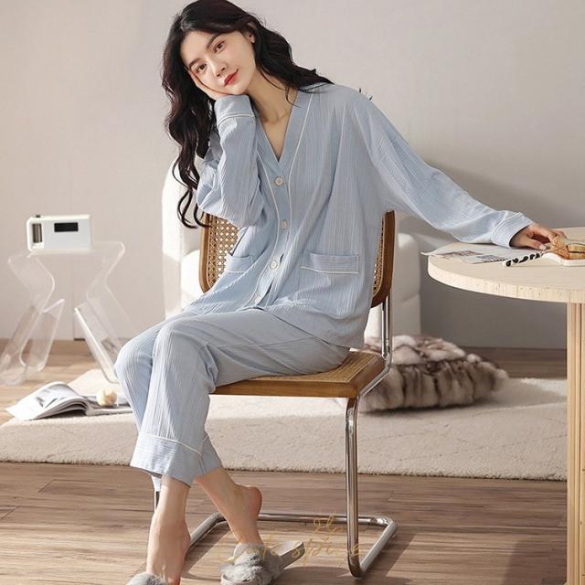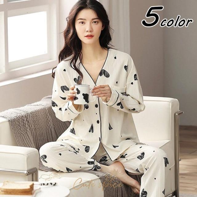 パジャマ ルームウェア レディース 春秋 長袖 パジャマ 前開きルームウェア ハート柄 vネック ロングパンツパンツ上下セット 可愛いパジャマ ゆったり