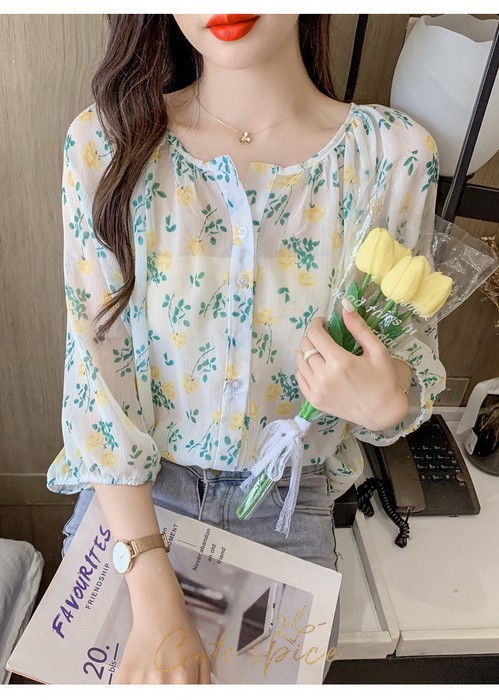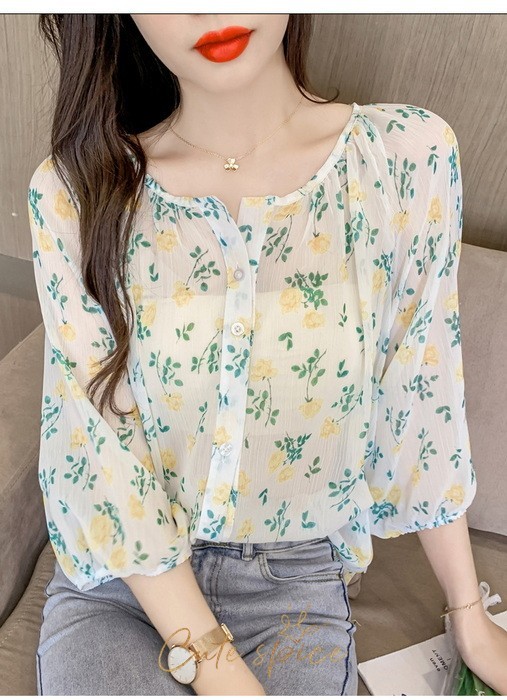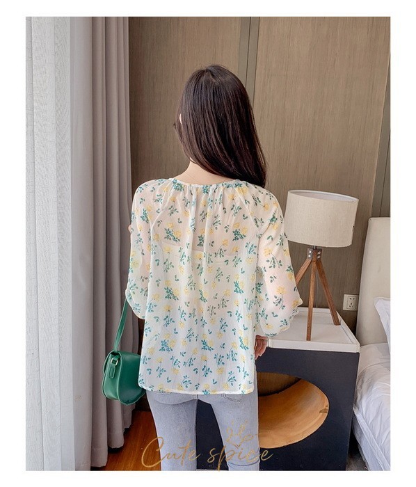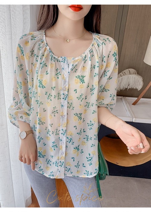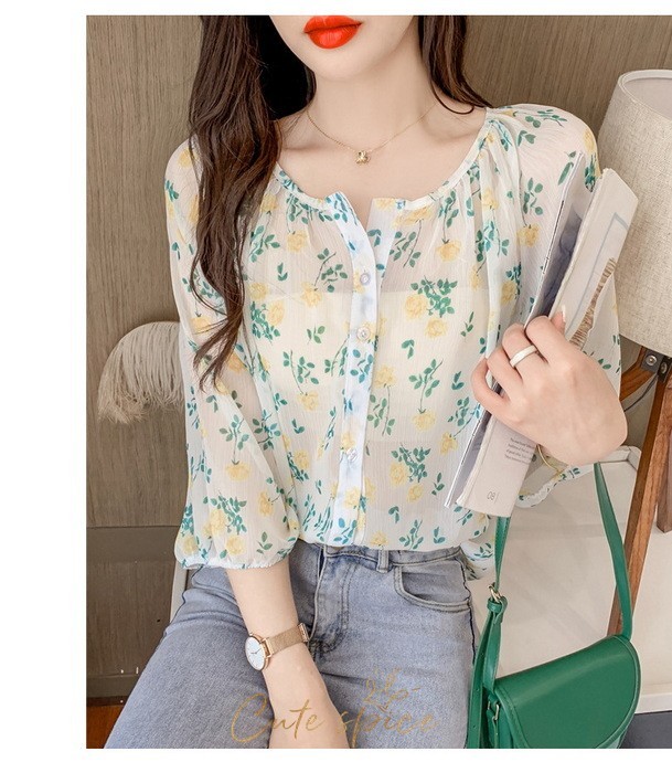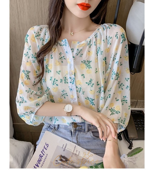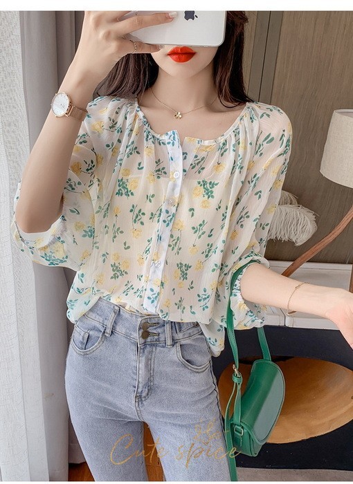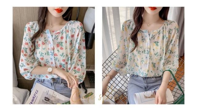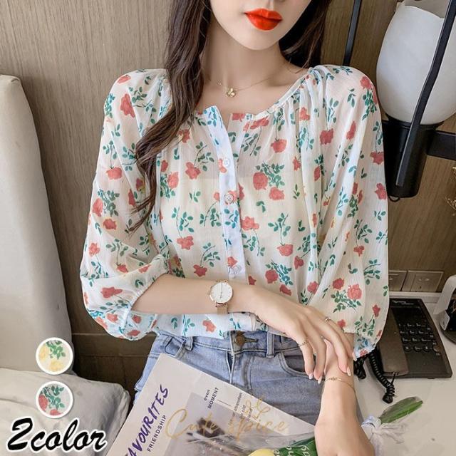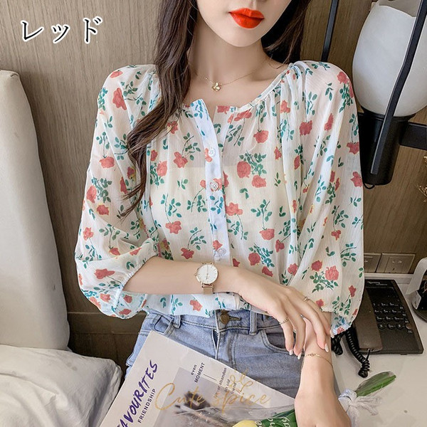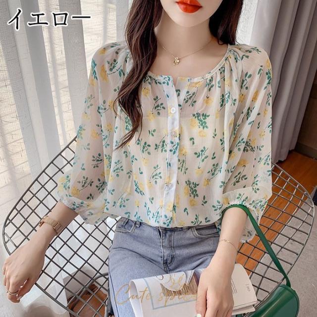 ブラウス レディース 40代 春夏新作 オシャレブラウス シフォンブラウス きれいめ花柄 パフスリーブ 五分袖トップス 韓国風 大人通勤 OL ゆったりシャツ 30代