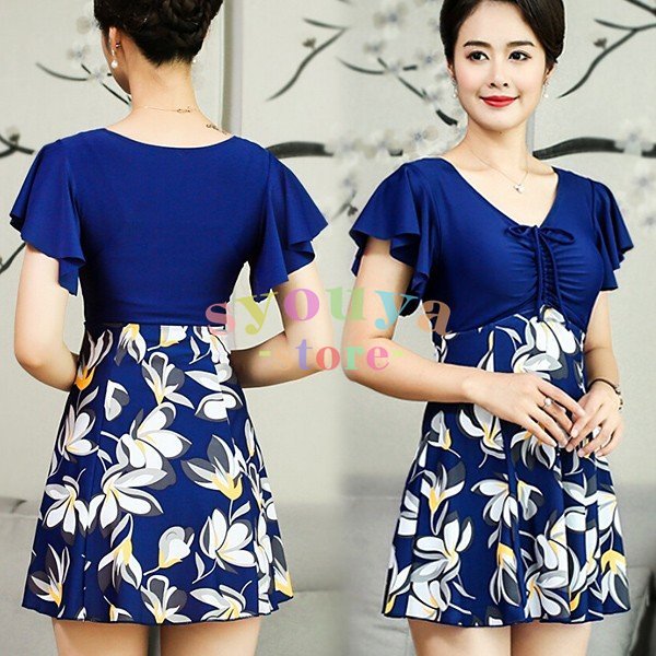 大きいサイズ 水着 レディース 夏らしいマリン風花柄 スイムウェア ママ水着 大きいサイズ 水着ワンピ みずぎ ミニワンピ ミニ丈 夏 パット入りセット