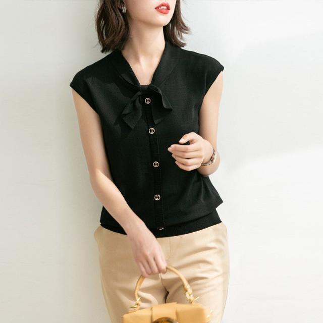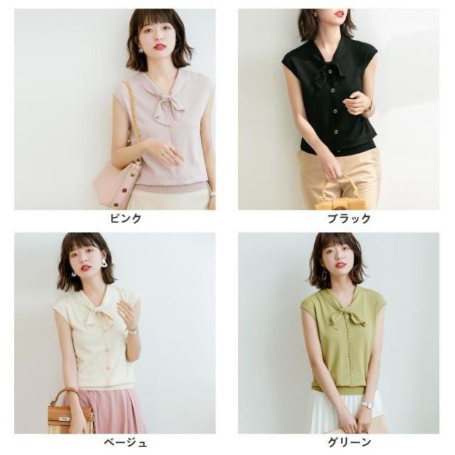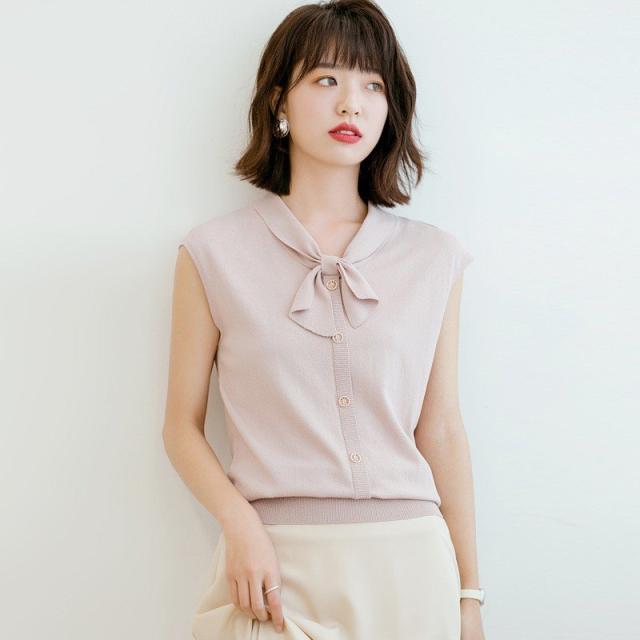 トップス レディース サマーニット サマーセーター ノースリーブ Vネック ボウタイ 無地 ボタン 薄手 夏向き 合わせやすい カジュアル おしゃれ