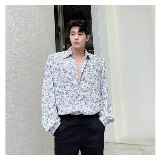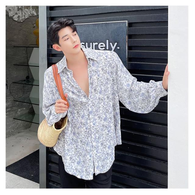 シャツ 長袖 カットソー ゆったり 花柄 総柄 yシャツ カジュアルシャツ メンズシャツ ドレスシャツ ボリューム袖 韓国 ファッション ジェンダーレス モード系