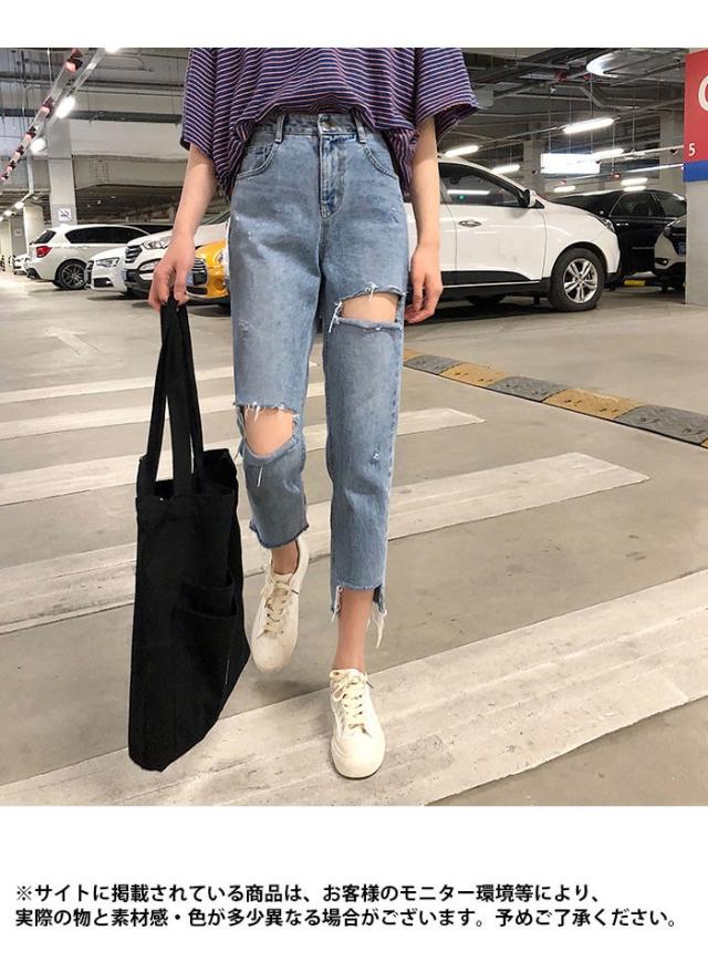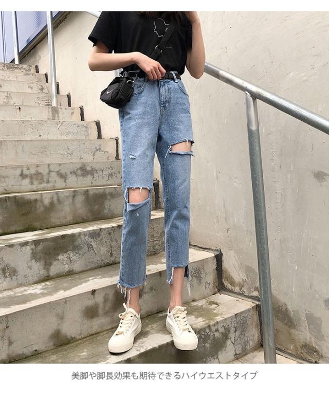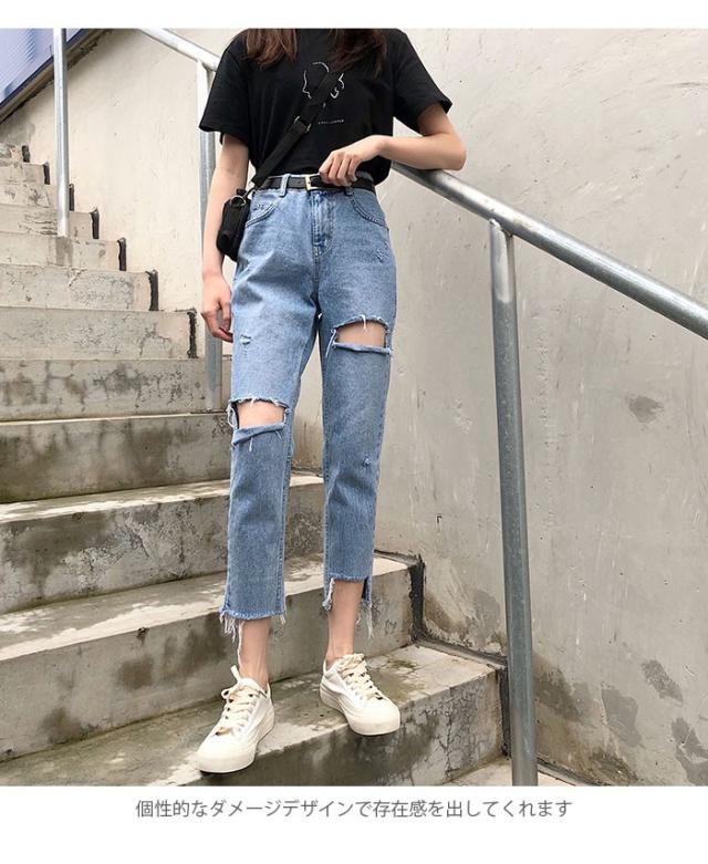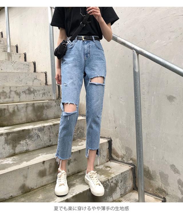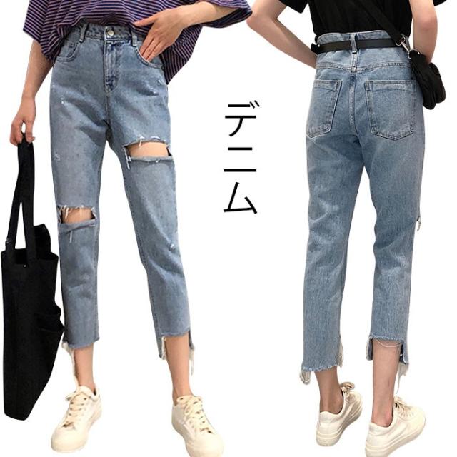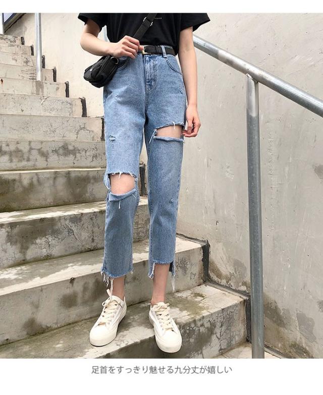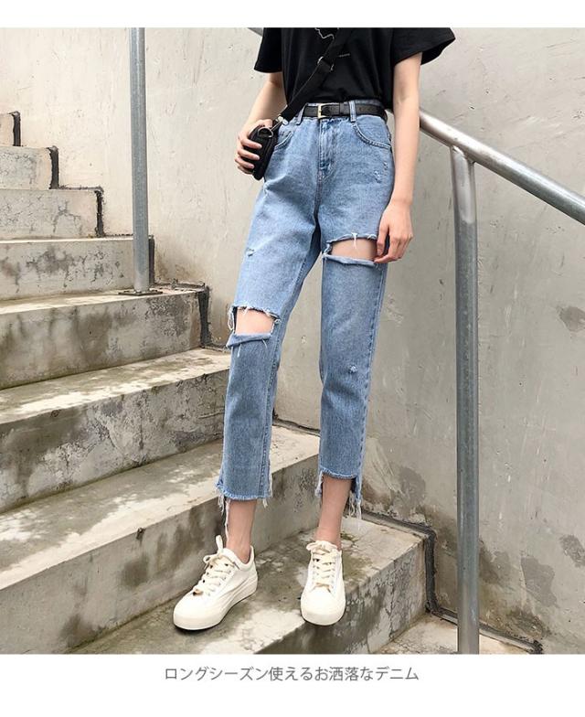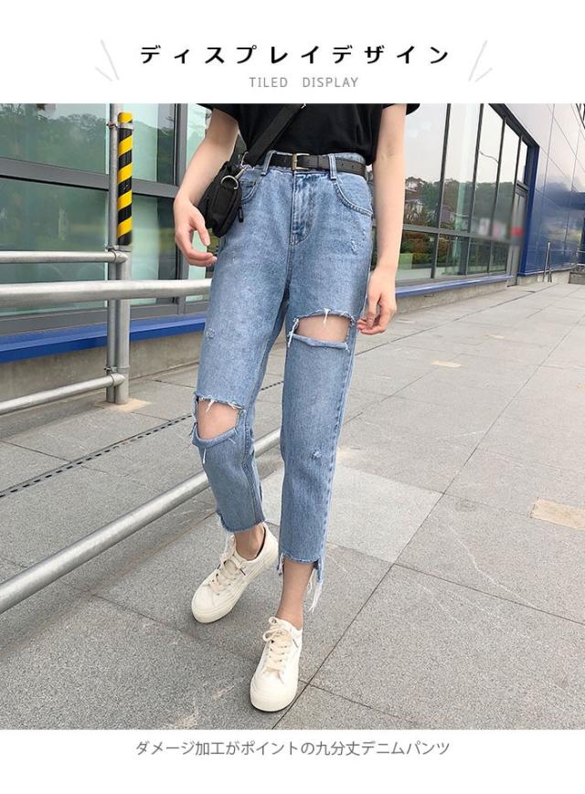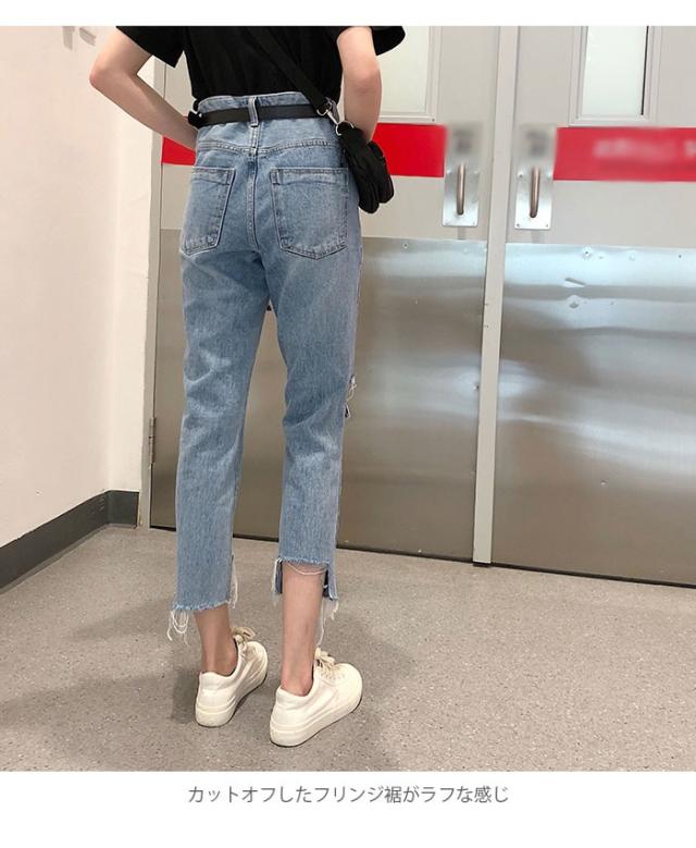 デニム レディース デニムパンツ 九分丈デニム 九分丈パンツ ダメージ加工 クラッシュデニム クラッシュ加工 ウォッシュ加工 薄手 色落ち カットオフ