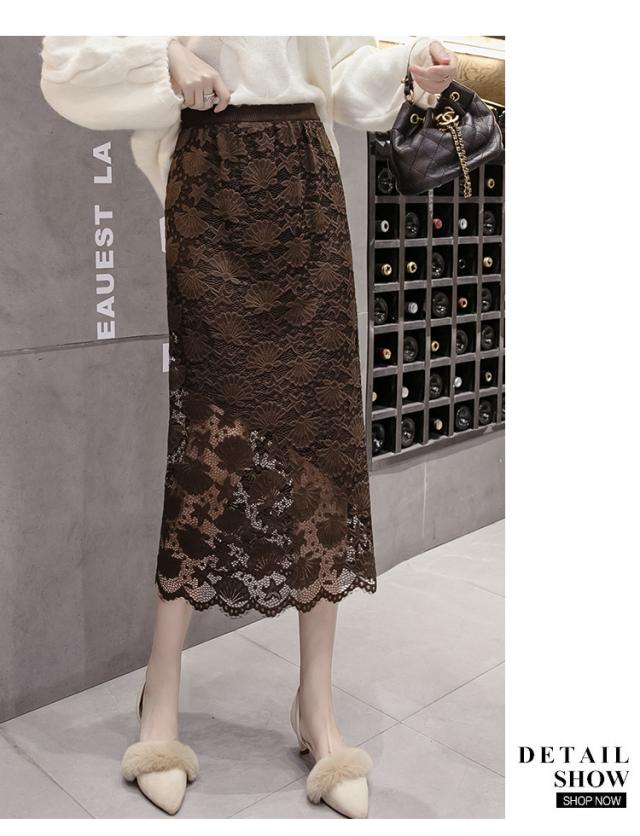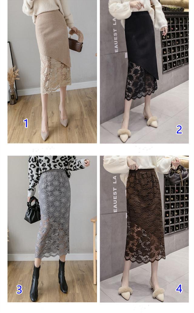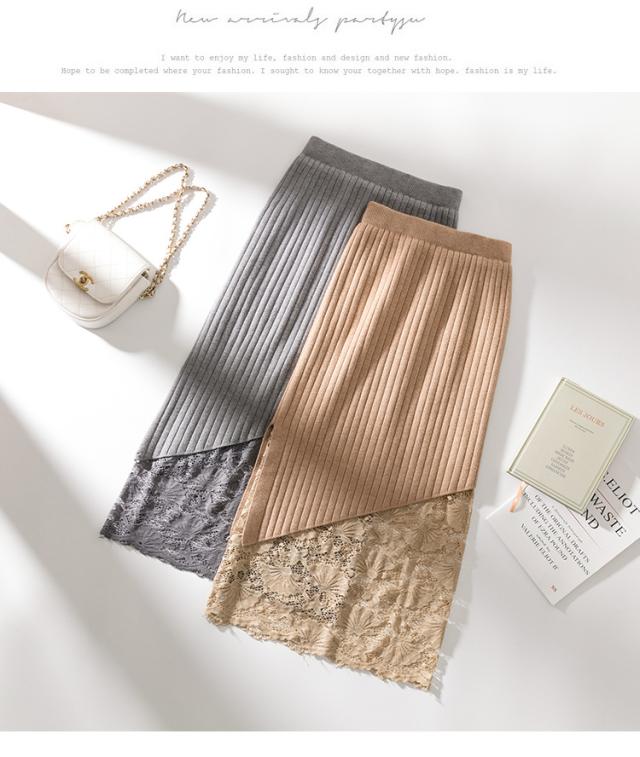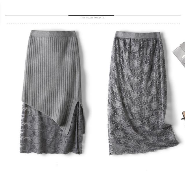 ニットスカート レーススカート レース切替 ロングスカート スカート 両面用 2way ミモレ丈スカート ウエストゴム 膝下丈 秋冬 おしゃれ 女性