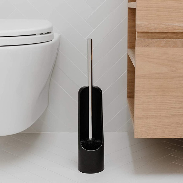 モノトーンのデザインがモダンな雰囲気を演出するトイレブラシです。小さすぎずちょうど使いやすいサイズで、収納の場所もとりません。ラバーのような質感を持つ樹脂製ケース付きです。ケースは背面が開いていて、ブラシを出し入れしやすいデザインになっています。