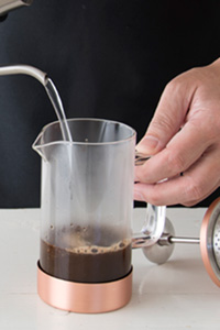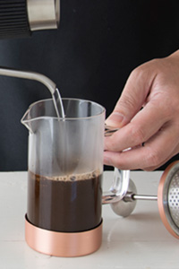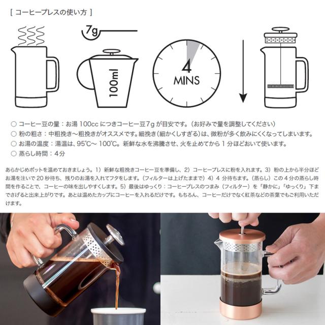 1)新鮮な粗挽きコーヒー豆を準備し、 2)コーヒープレスに粉を入れます。 3)コーヒープレスに粉の上から半分ほどお湯を注いで20秒待ち、 |