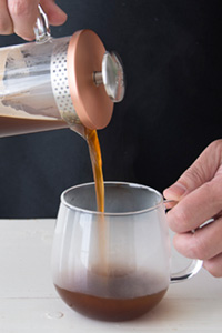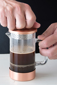 5) 最後はゆっくり:コーヒープレスのつまみ(フィルター)を「静かに」「ゆっくり」下までさげると出来上がりです。 あとは温めたカップにコーヒーを入れるだけです。 |