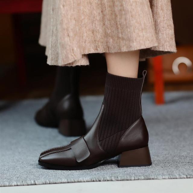 ショートブーツ レディース ソックスブーツ ブーツ チャンキーヒール 秋冬 スムース 太ヒール シンプル 黒 ストレッチ 裏起毛 PU 合成皮革 4.5cmヒール